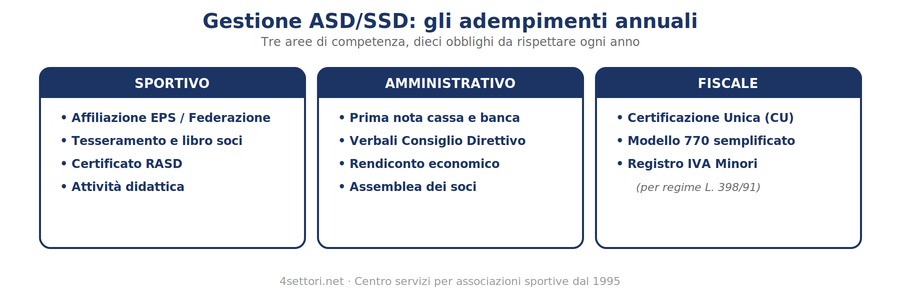 4Settori dal 1995 segue le associazioni partendo dalla costituzione, passando per l'affiliazione ed il tesseramento, e gestendo la contabilità.