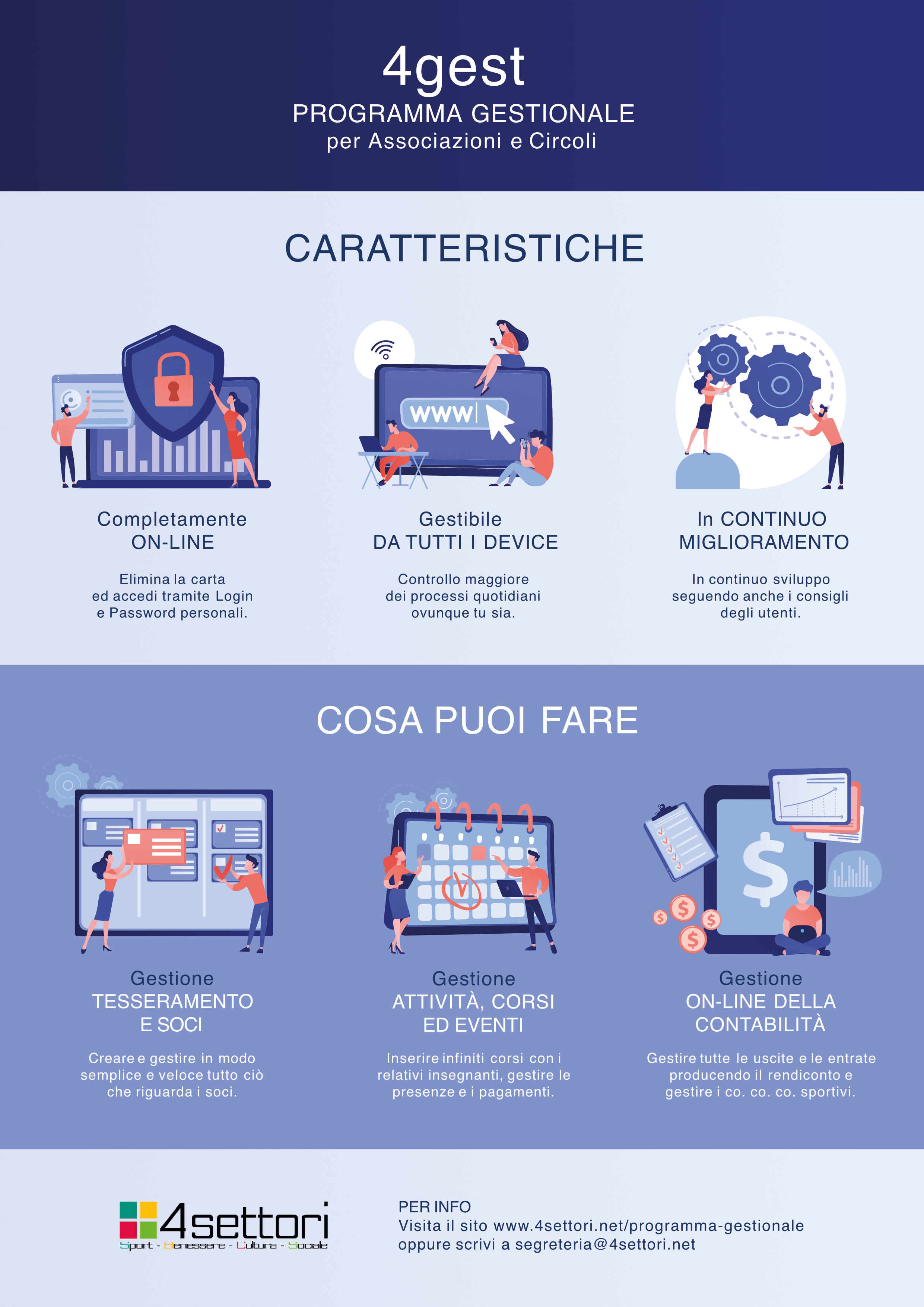 Il nostro programma di gestione delle associazioni è stato ideato da 4Settori che, con la sua esperienza ventennale, ha realizzato un prodotto adatto alle molteplici esigenze delle Associazioni che siano esse Sportive, Culturali, Ricreative o di Promozione Sociale.