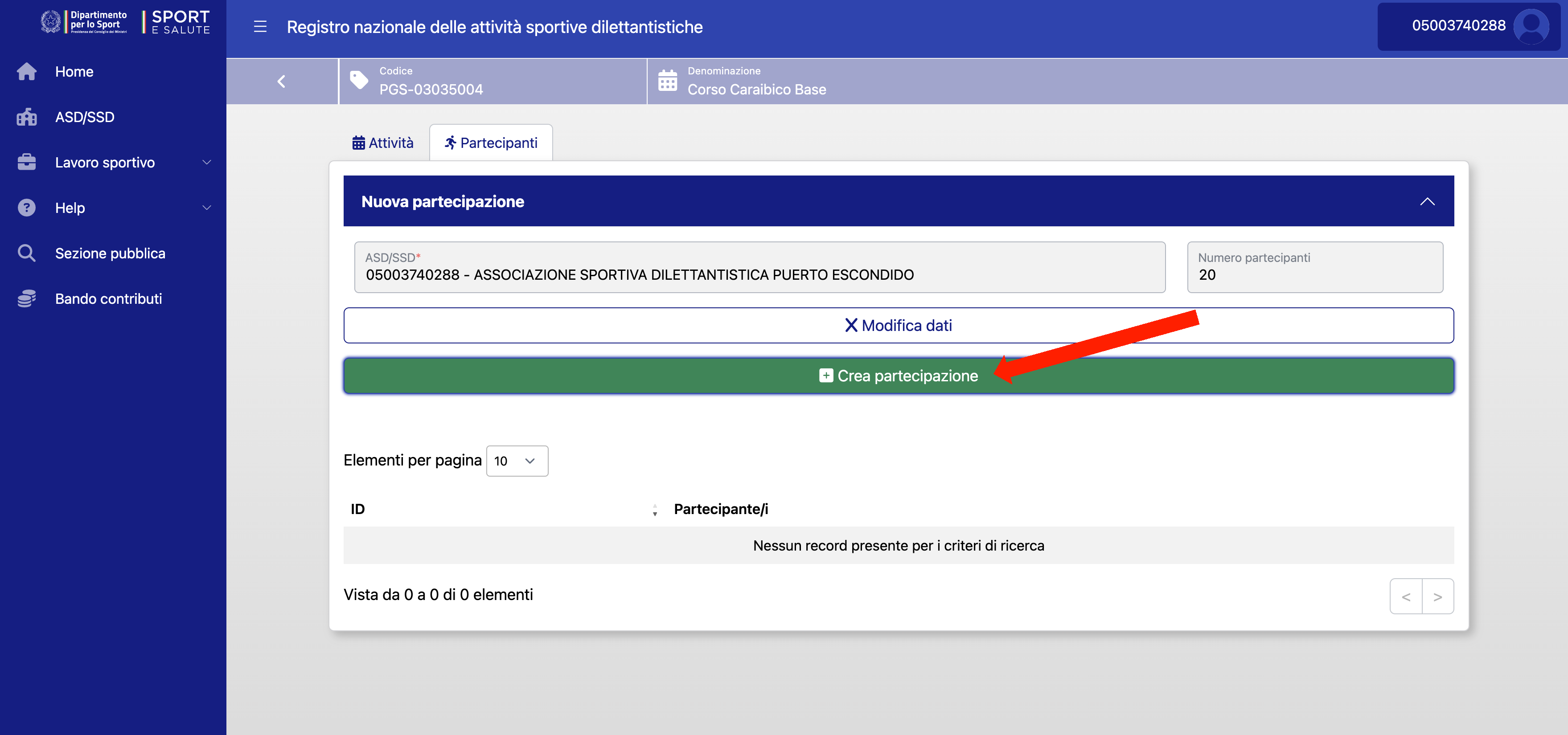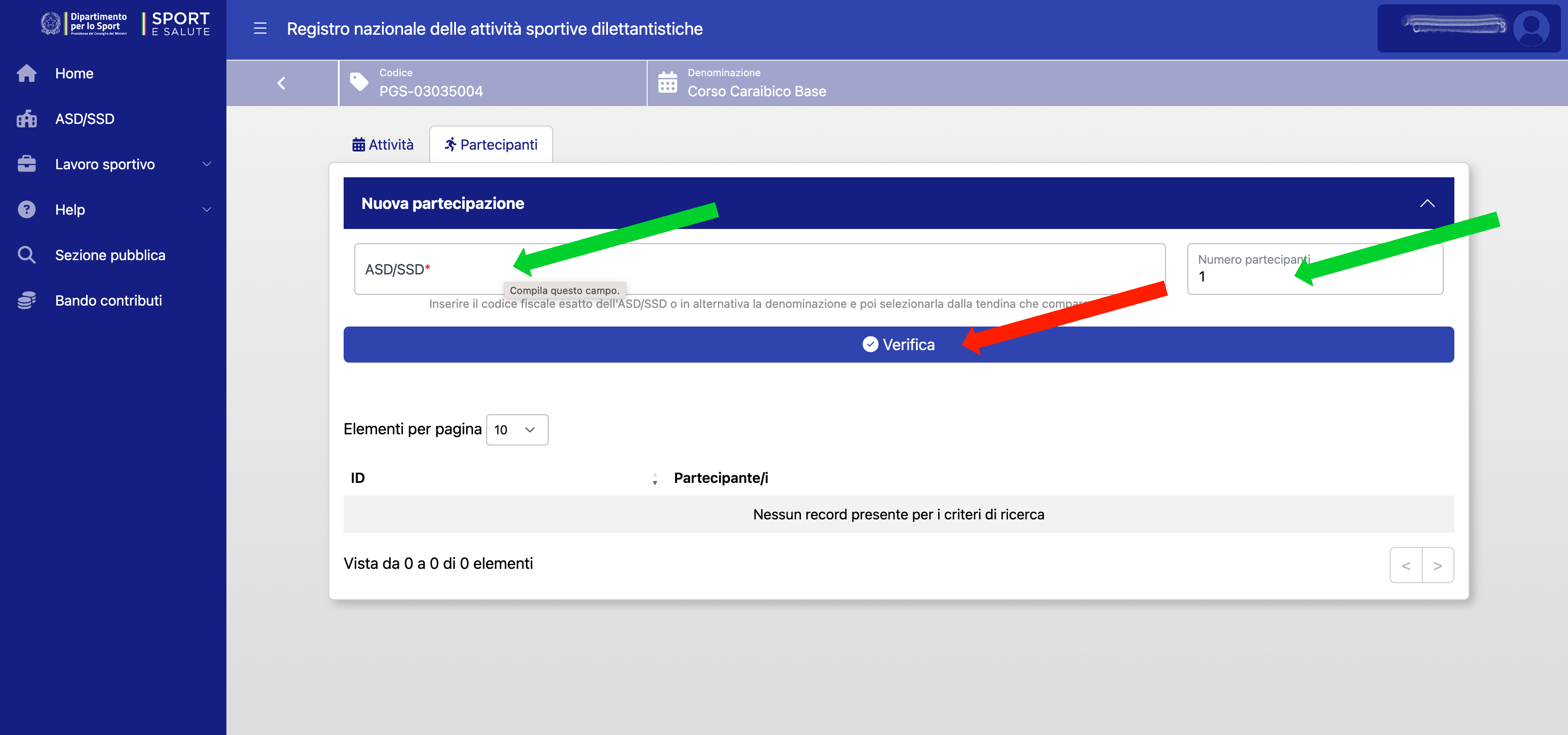 Organismo: selezionare l'ENTE di affiliazione con cui si è svolta l'attività),