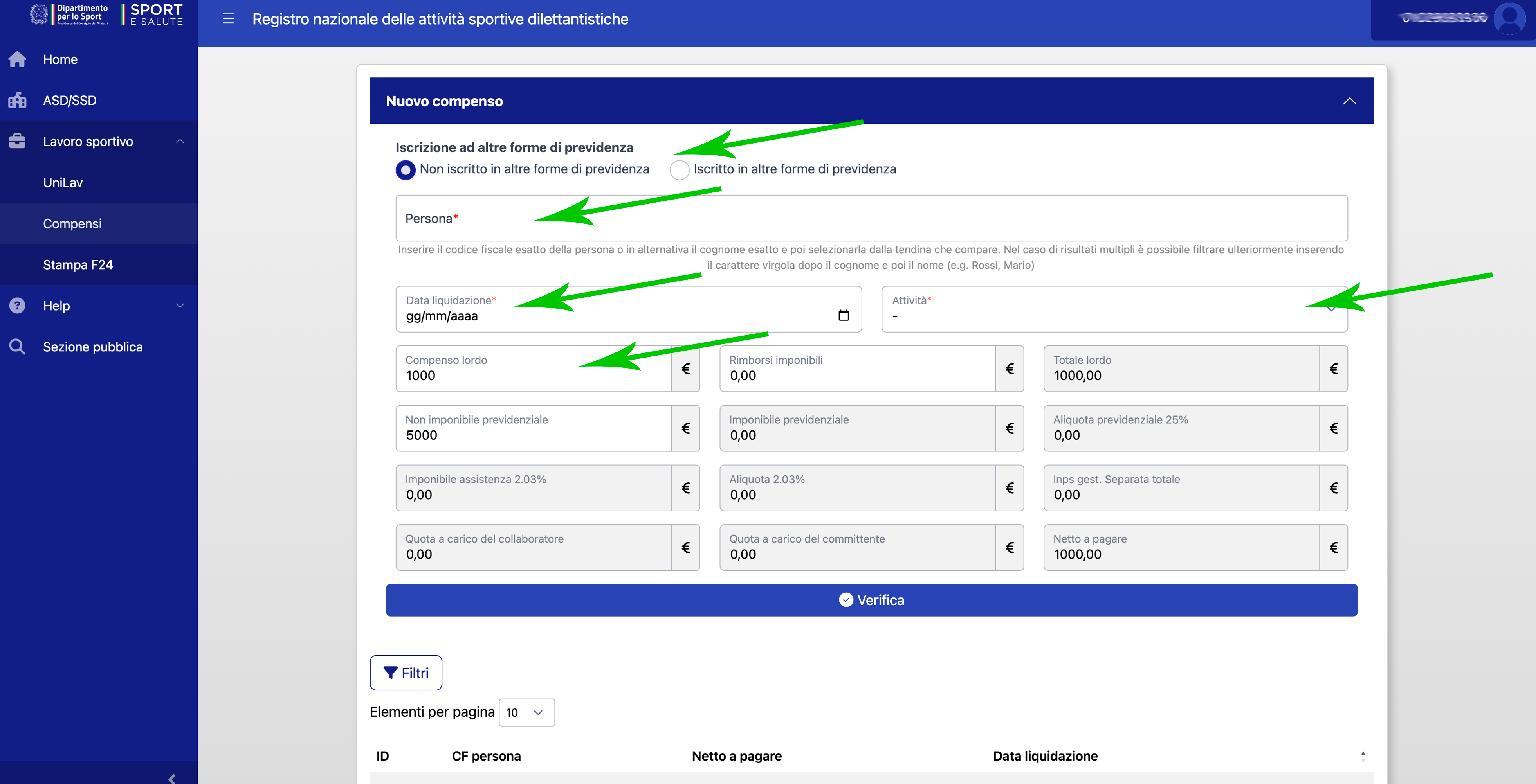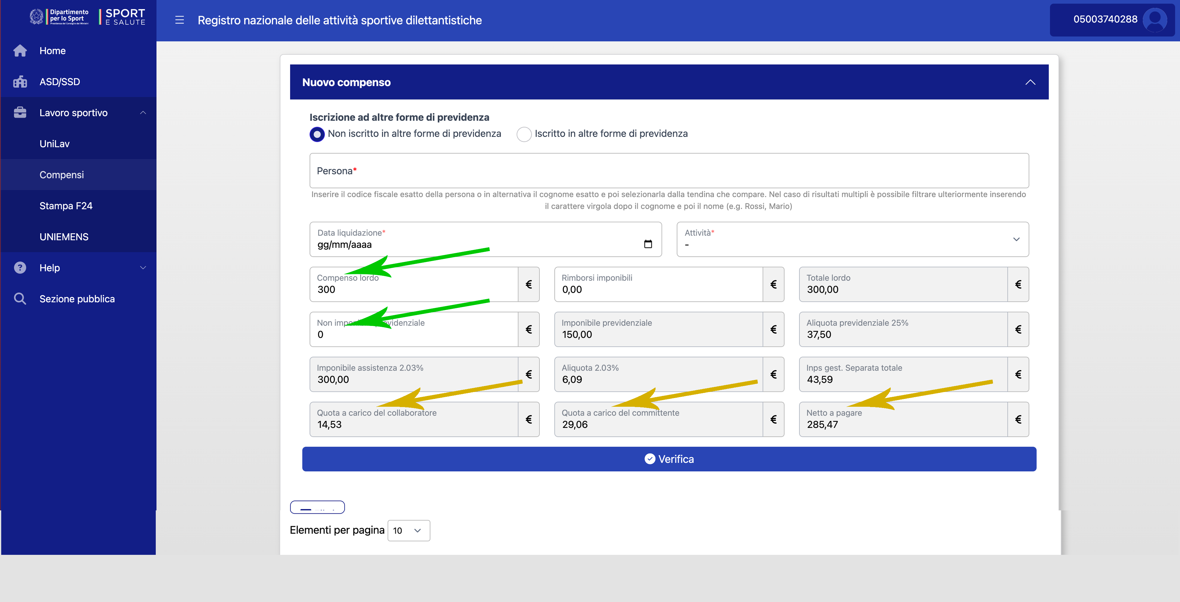 Il sistema calcola il netto a pagare, la quota a carico del committente e quota a carico del collaboratore (frecce gialle).