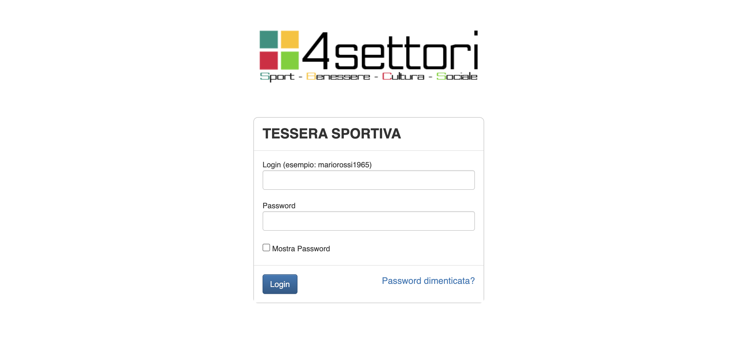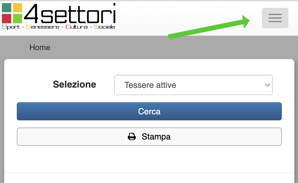 Andare da un telefonino o tablet (ma anche da un pc) al sito internet www.tesserasportiva.it e loggarsi inserendo come user il proprio nome, cognome e anno di nascita scritto tutto minuscolo ed attaccato. Di default anche la password è la stessa (consigliamo sempre di cambiarla dopo il primo accesso).
