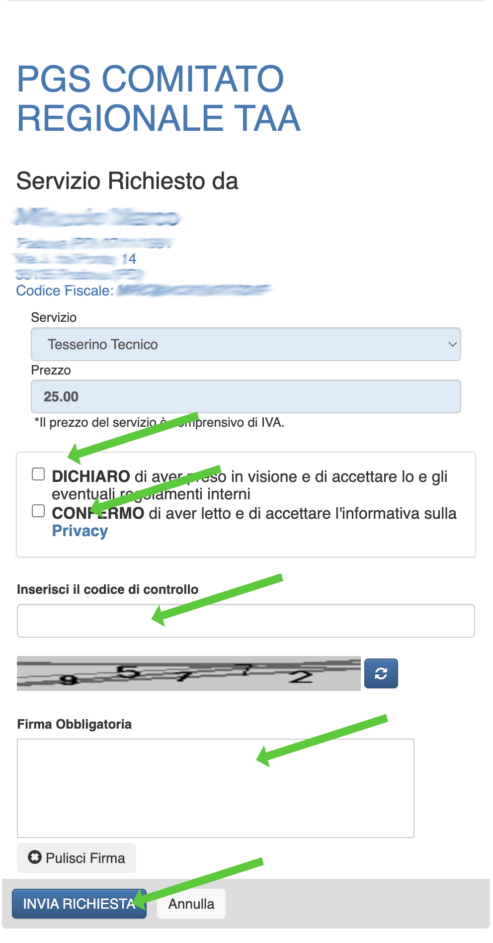 Inserire le spunte del consenso e della privacy, inserire il codice di controllo e firmare sul telefonino con il dito. Premere sul pulsante INVIA RICHIESTA.