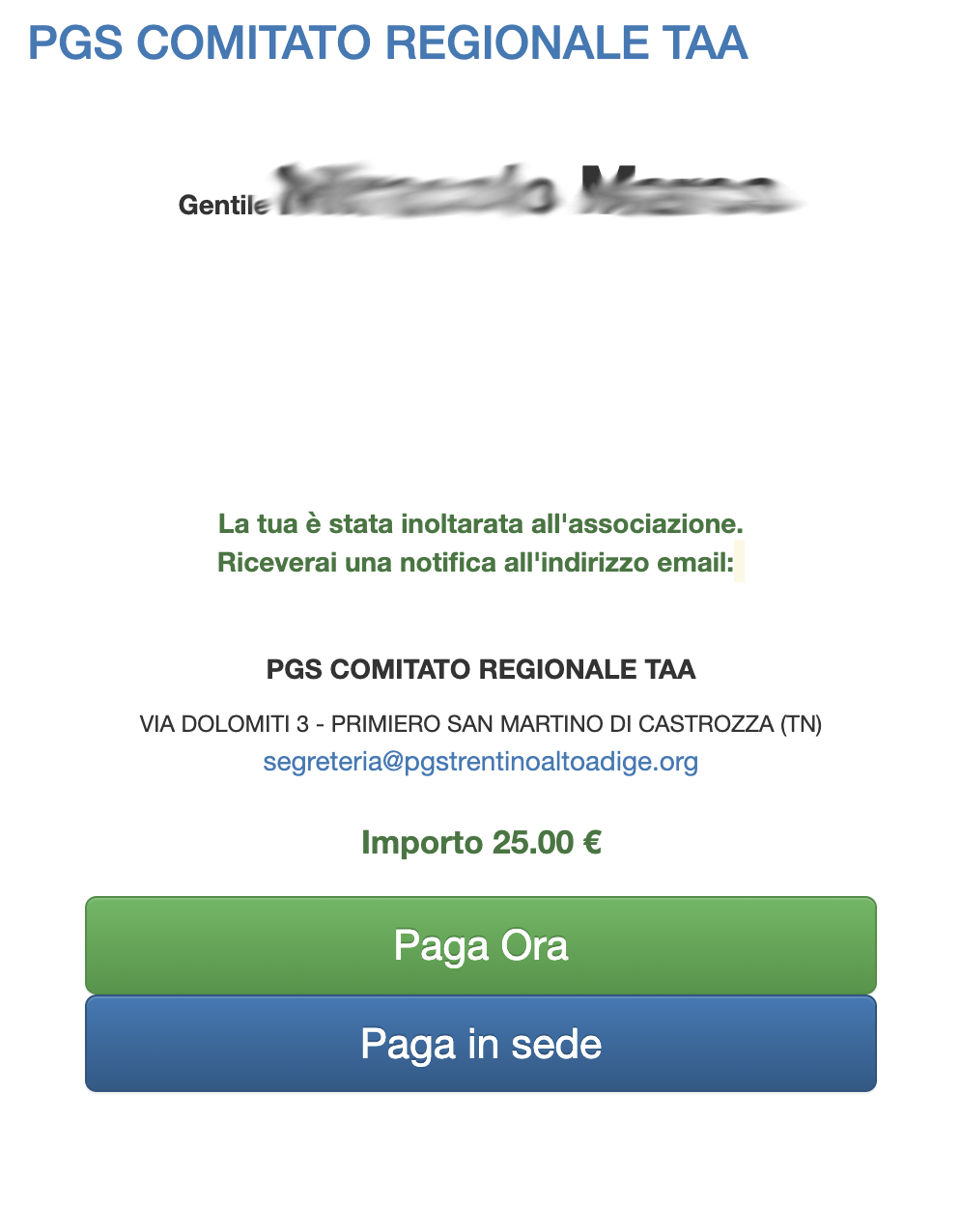 Cliccando sul pulsante PAGA IN SEDE bisognerà recarsi in sede per pagare in contanti oppure accordarsi per il pagamento con bonifico.