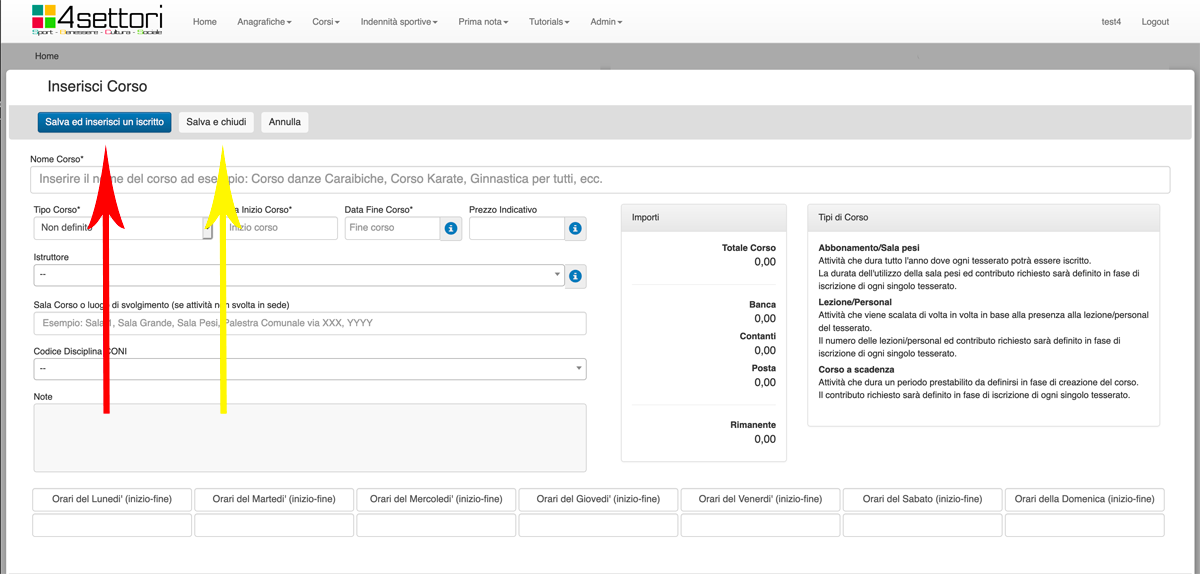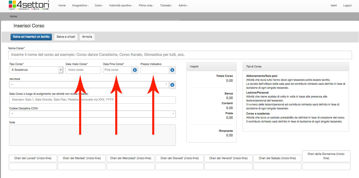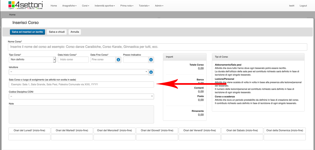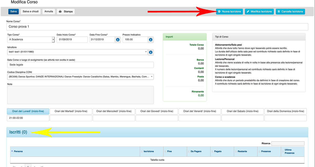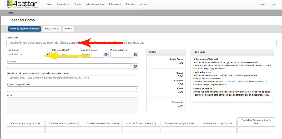 Nel campo Nome Corso (freccia rossa) inserire il nome del Corso che si vuole organzzare. Può essere un nome del tipo "Corso Balli Caraibici Livello Base", o "Corso Karate Cintura Verde", o "Ginnastica Aerobica Settembre".