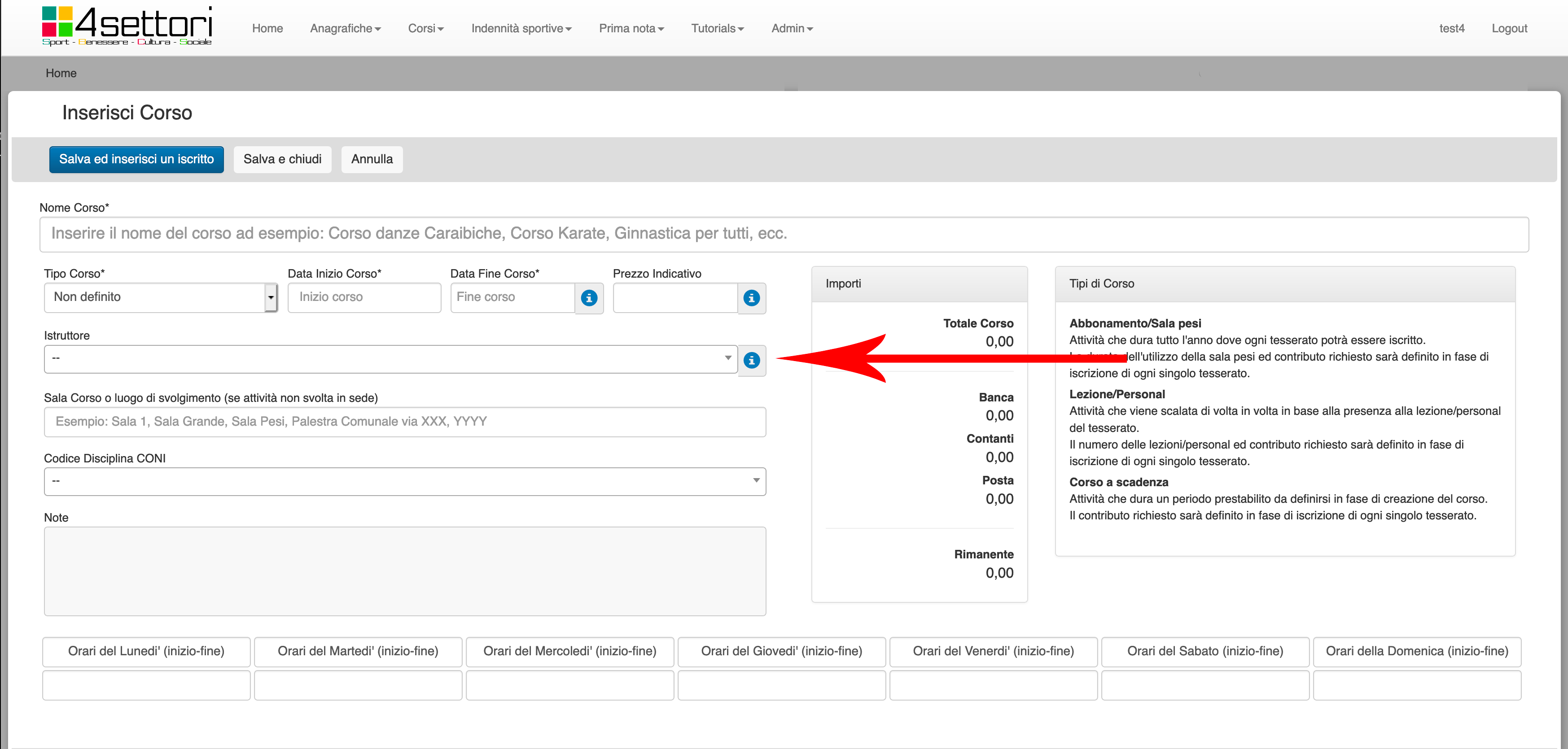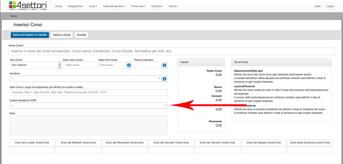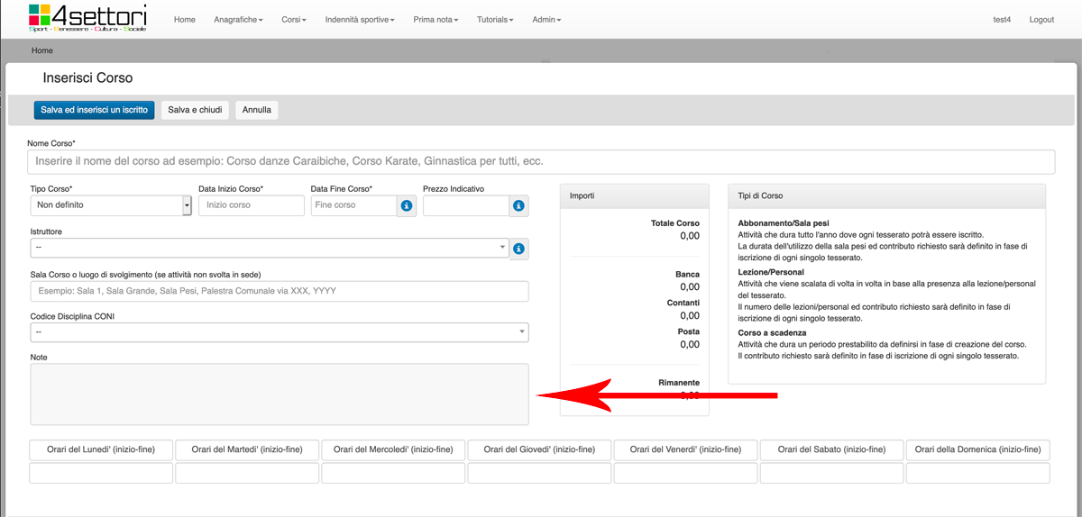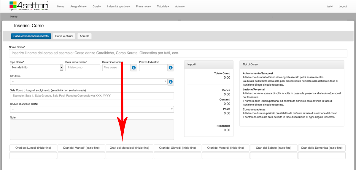 Nel campo Nome Corso (freccia rossa) inserire il nome del Corso che si vuole organzzare. Può essere un nome del tipo "Corso Balli Caraibici Livello Base", o "Corso Karate Cintura Verde", o "Ginnastica Aerobica Settembre".