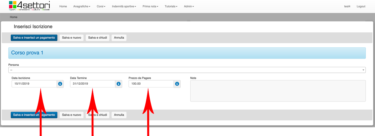 Nel campo Persona (freccia rossa) cercare, con il menù a tendina e con il cerca incorporato nel campo, la persona da iscrivere al corso.
