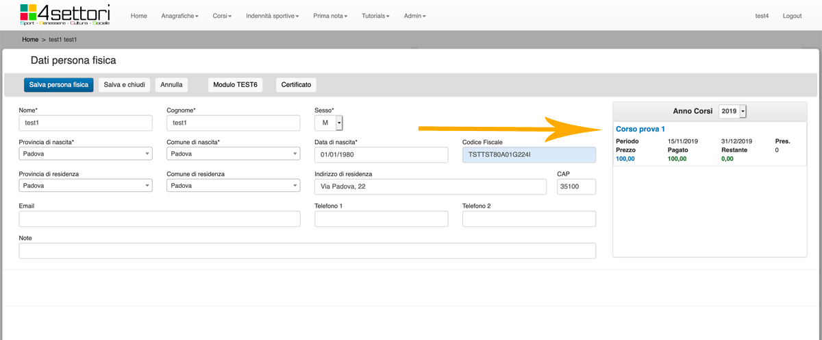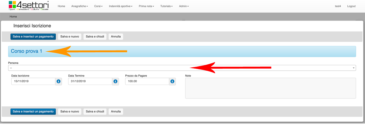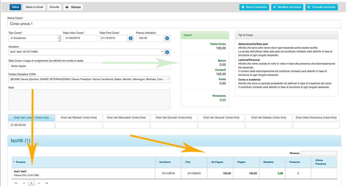 La freccia arancione ci segnala che stiamo inserendo una persona in quel corso (nel nostro esempio Corso prova 1).