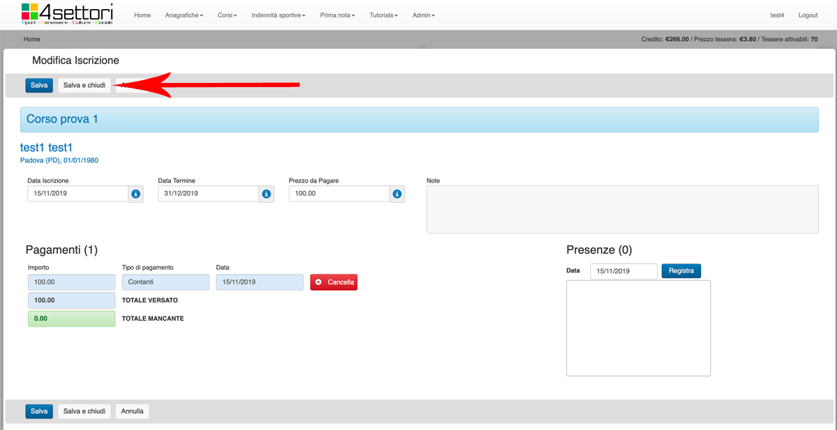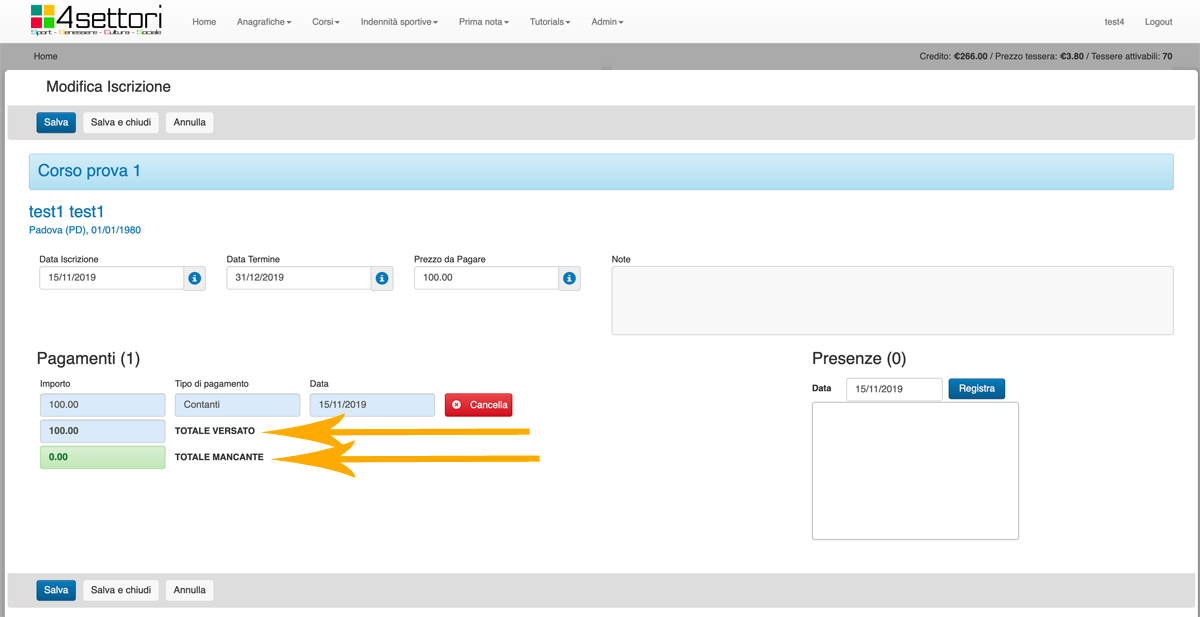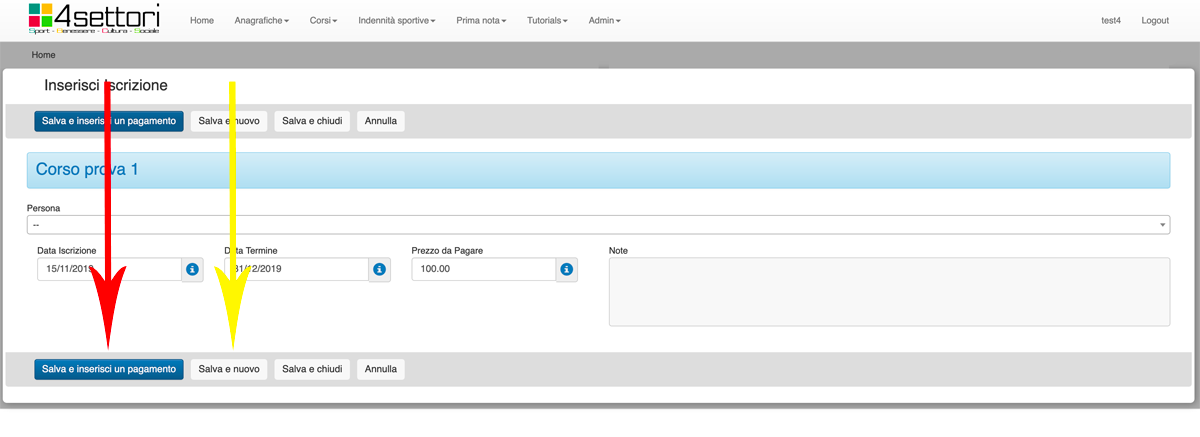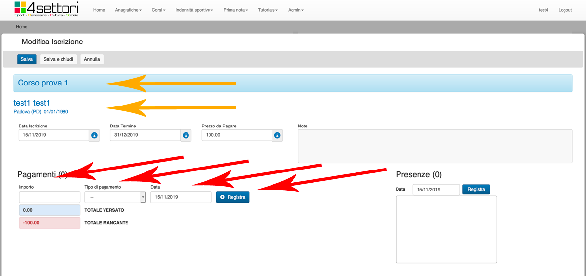Le freccie arancioni ci fanno vedere per quale corso e per quale iscritto stiamo inserendo l'operazione.