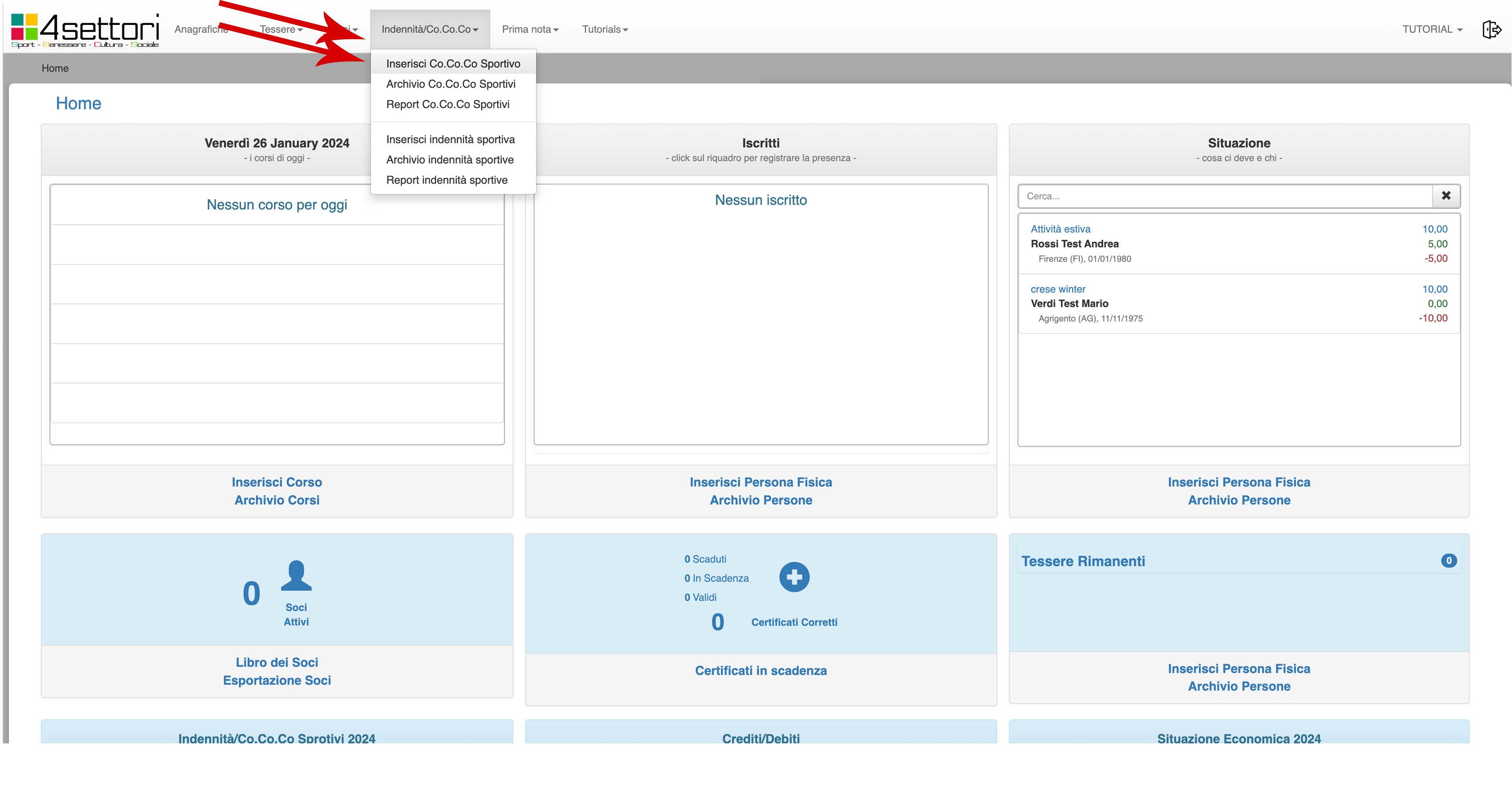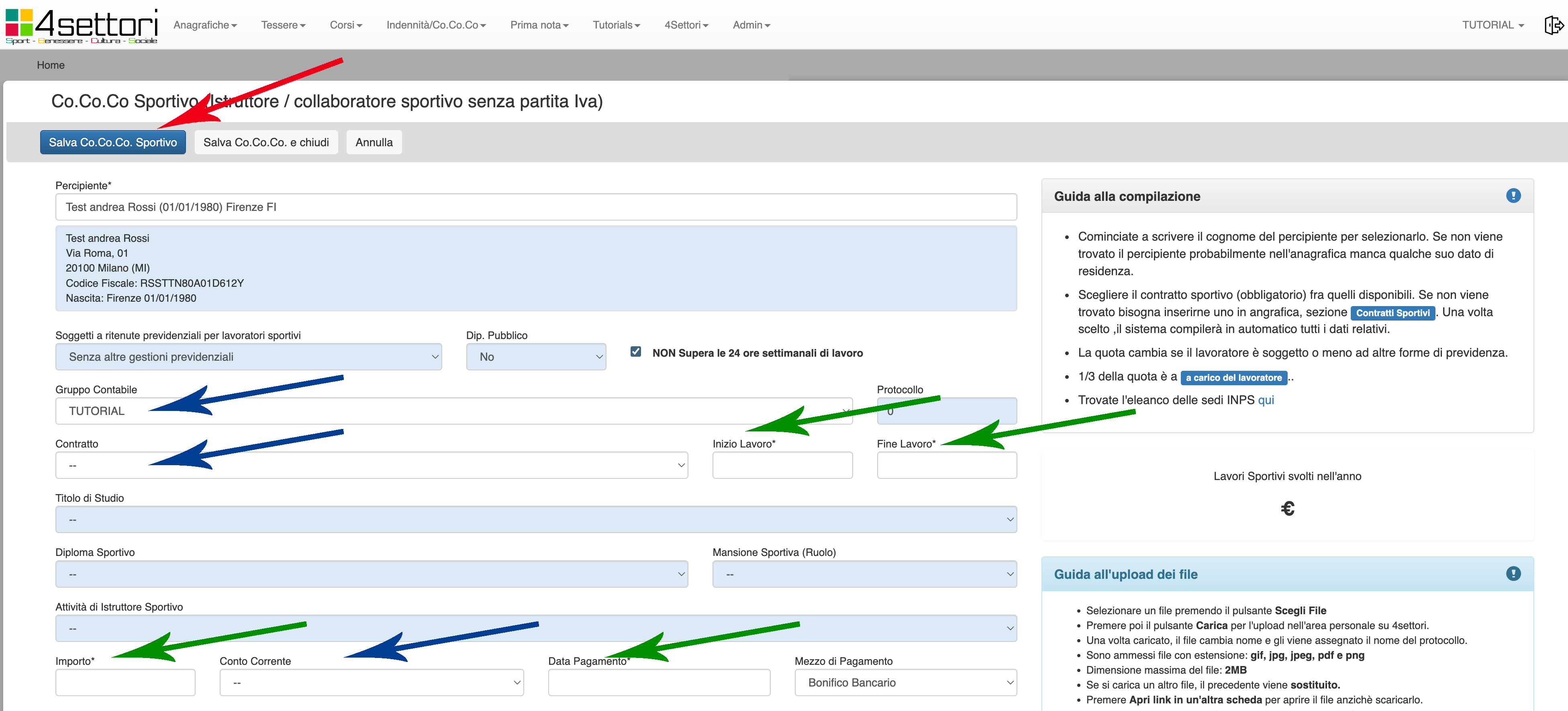 Di seguito le istruzioni per inserire in 4gest i compensi erogati da prestazione eseguite dai Co. Co. Co. Sportivi.