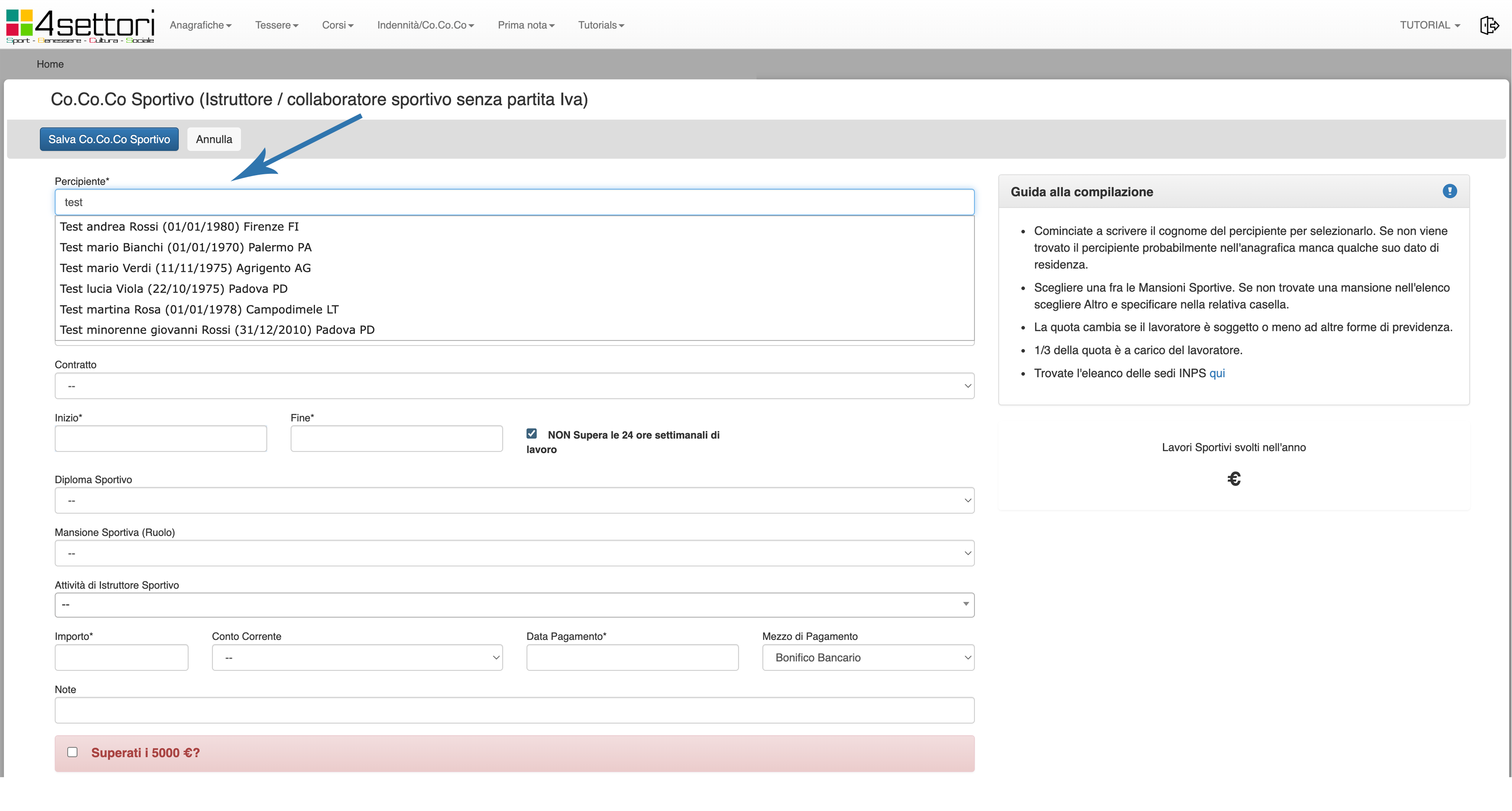 Iniziando a digitare il nome o cognome dell'istruttore di cui dobbiamo inserire il compenso, il sistema ci restituirà un elenco di nomi trovati nelle anagrafiche. Selezioniamo quello che ci interessa.