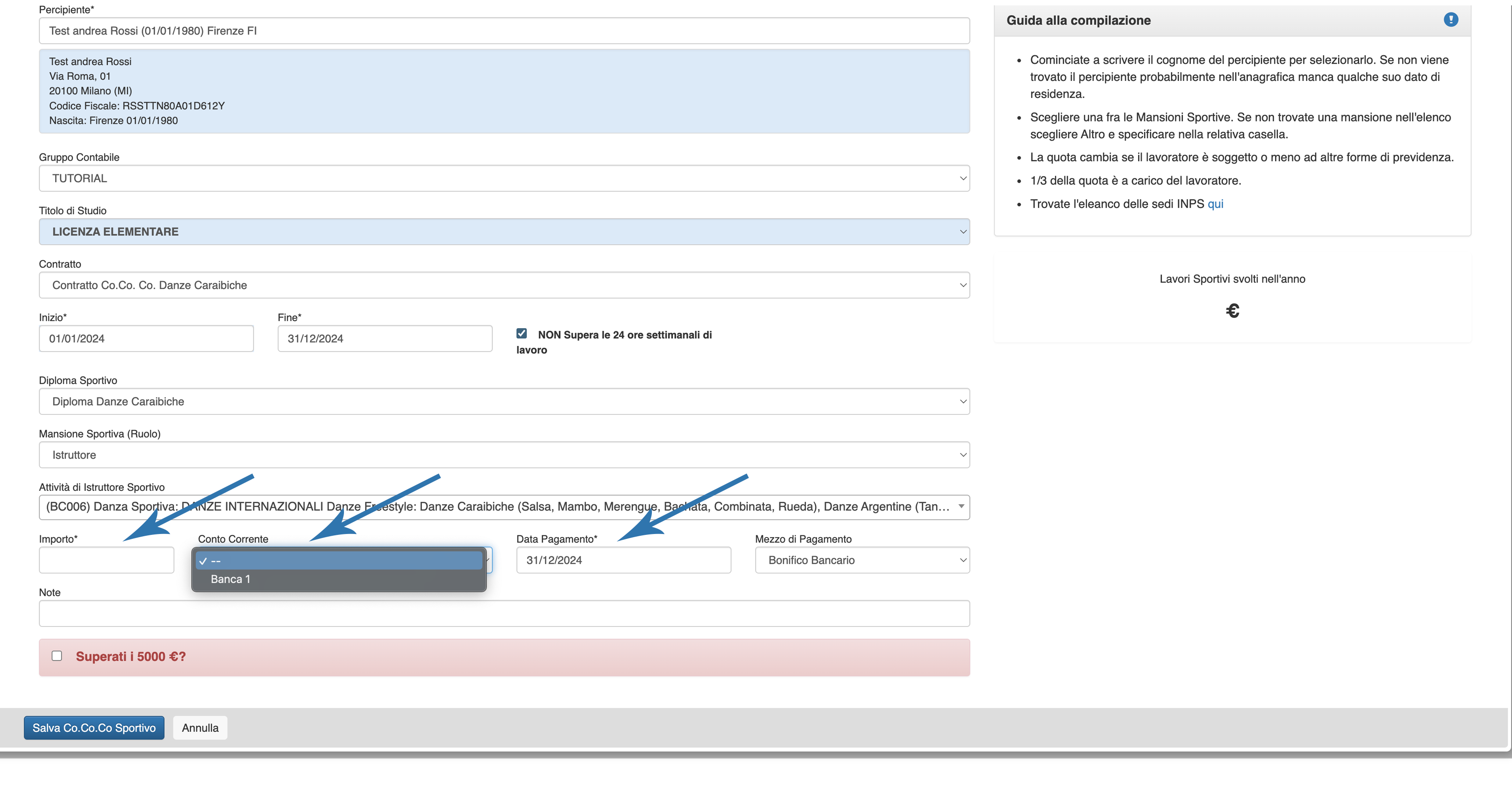Se, con questo pagamento l'istruttore supera i 5.000,00 euro, bisogna selezionare la spunta "Superati i 5.000,00 E?"