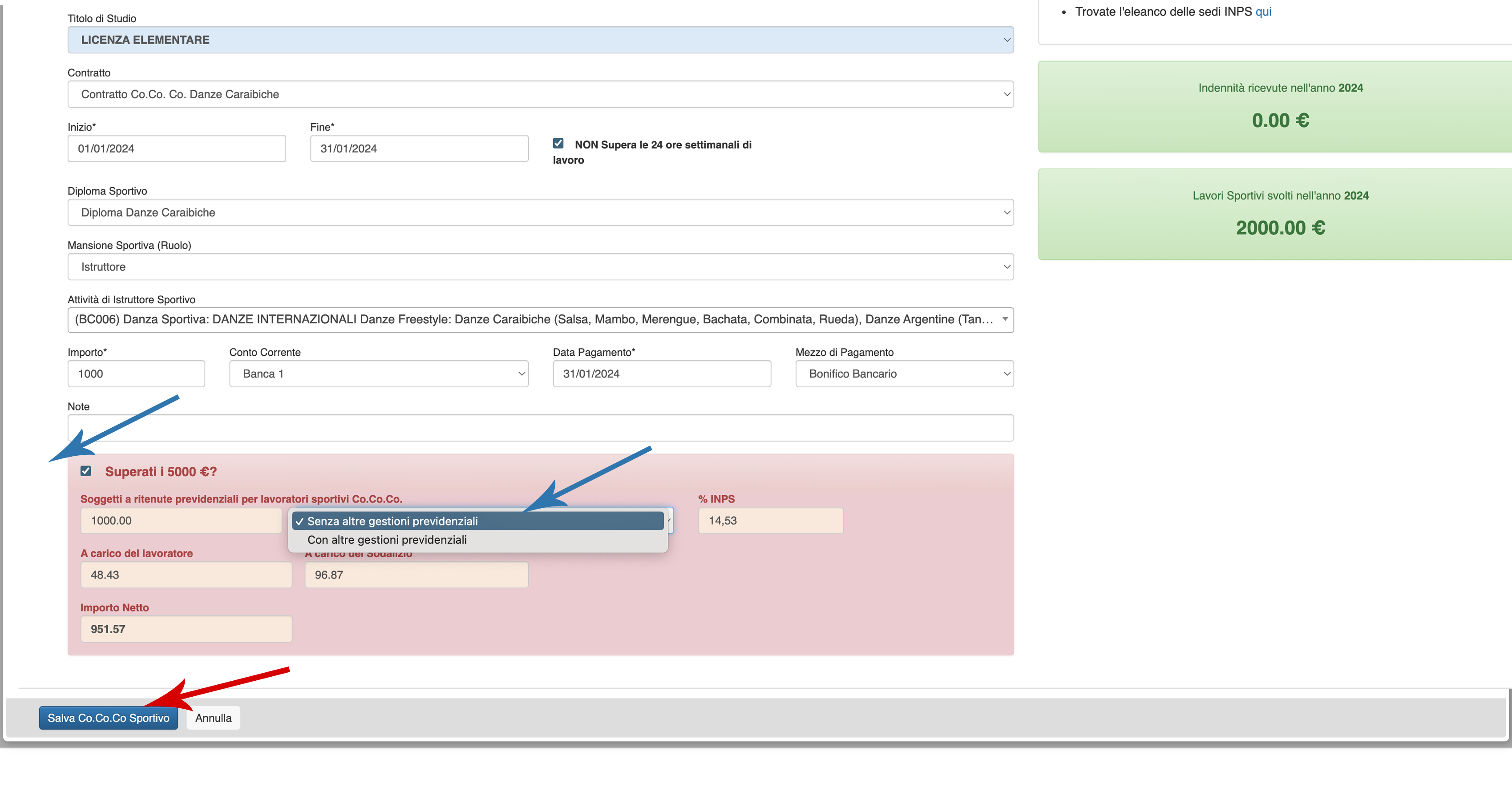 L'importo (nel nostro esempio 1.000,00 euro) diventa lordo e il sistema calcola l'importo netto. Per calcolarlo bisogna selezionare, nel menu a tendina, se l'Istruttore in Co.Co.Co. Sportivo è senza o con altre gestioni previdenziali.
