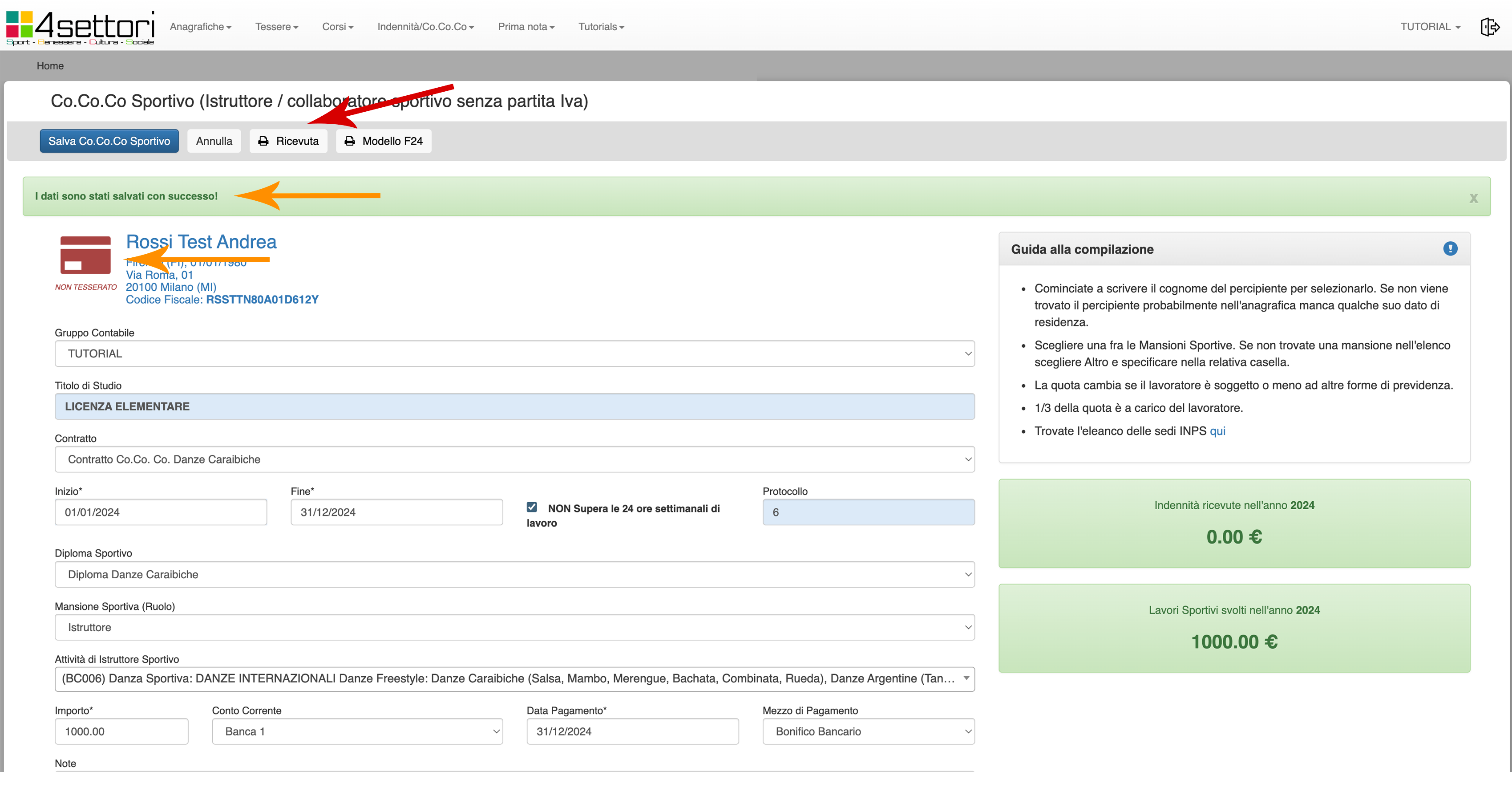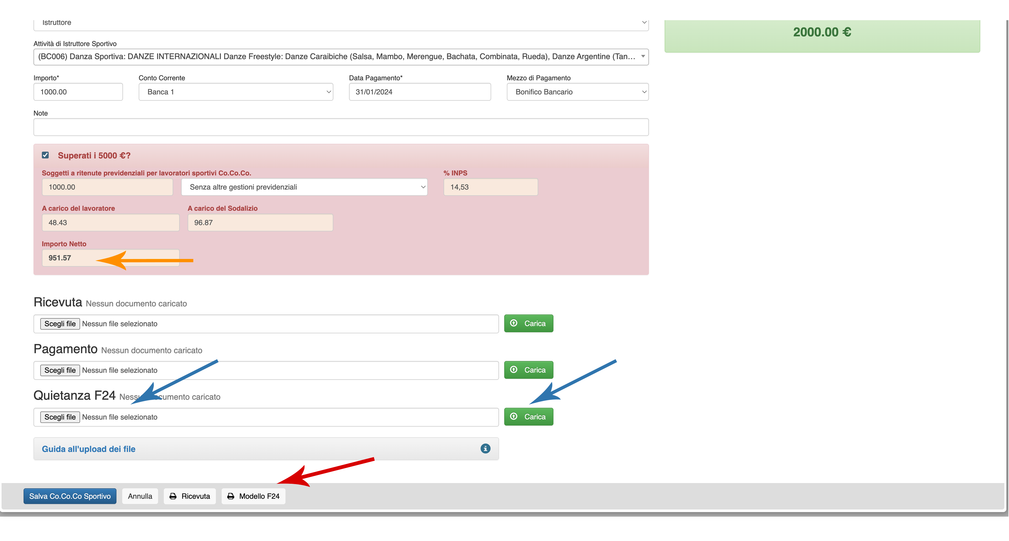 Il sistema calcola il netto da erogare con bonifico all'Istruttore Co.Co.Co. Sportivo (nel nostro caso 951,57 -freccia arancione-) e, come prima, si potrà inserire la quietanza F24 di pagamento della percentuale INAIL versata.