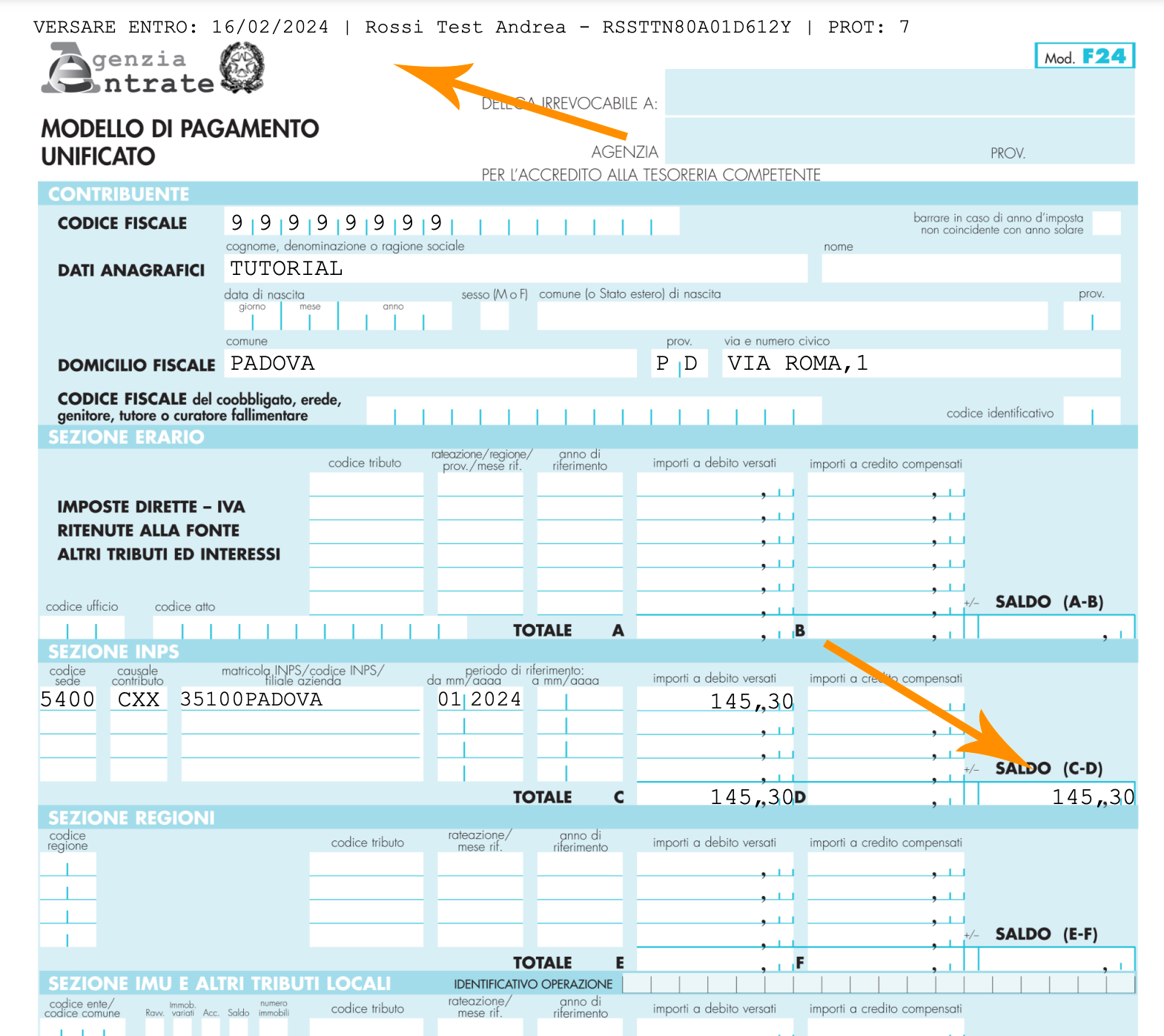 Il modello F24 generato, oltre ai dati del sodalizio, ci riporta in alto la scadenza e per chi stiamo pagando questo F24 (dati che non saranno da inserire nell'internet banking del conto del sodalizio).