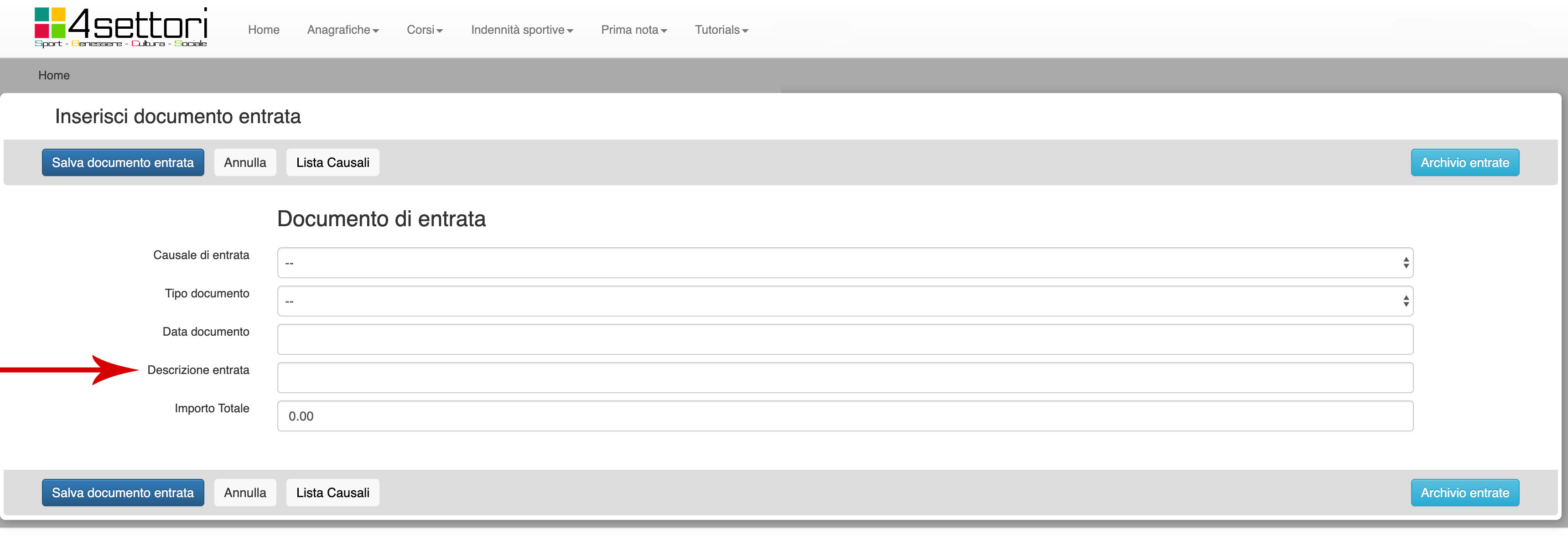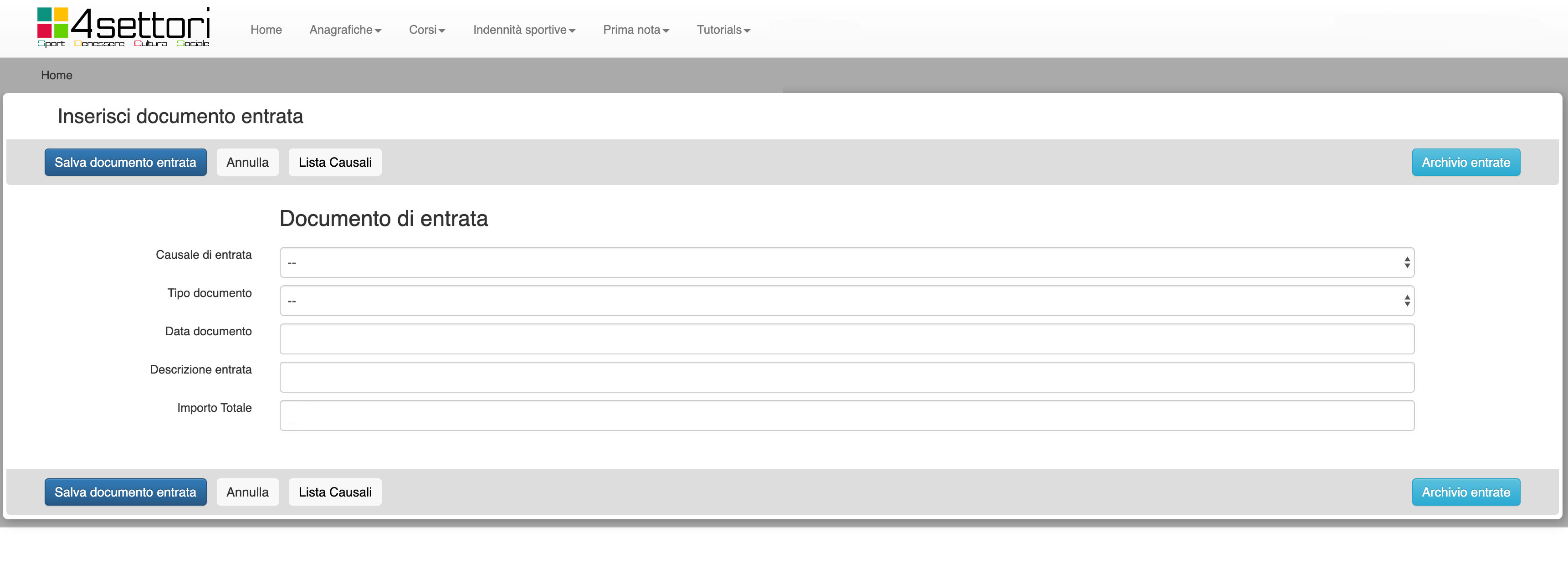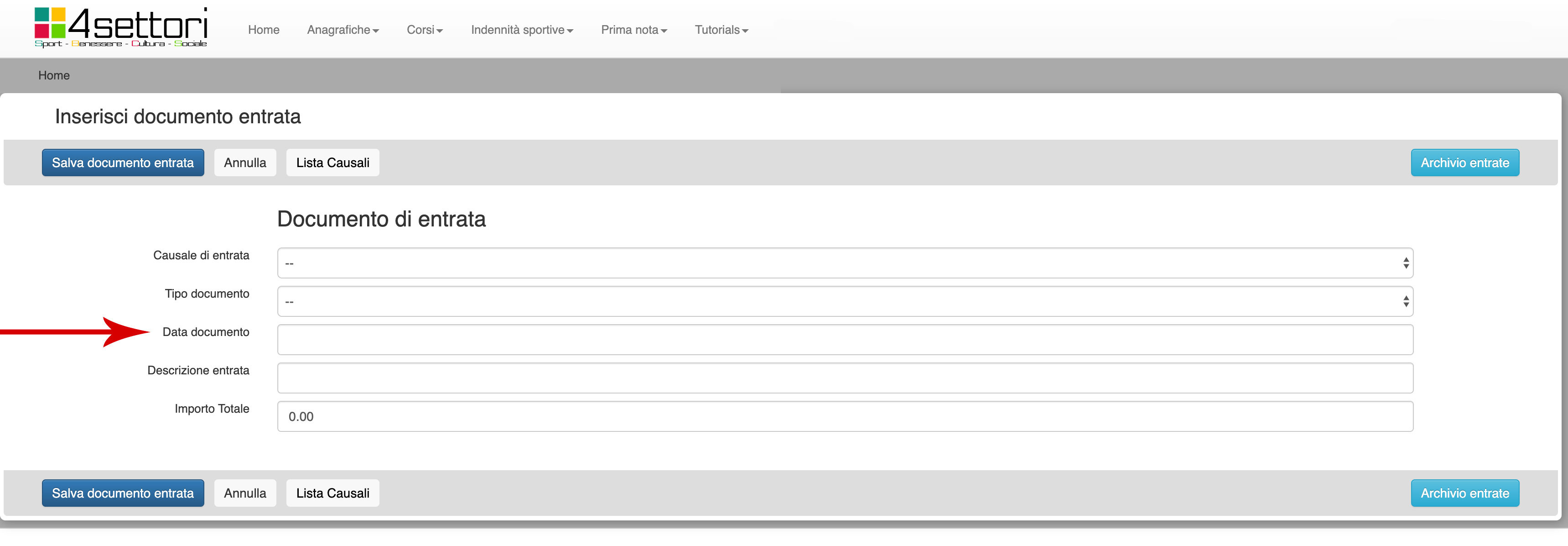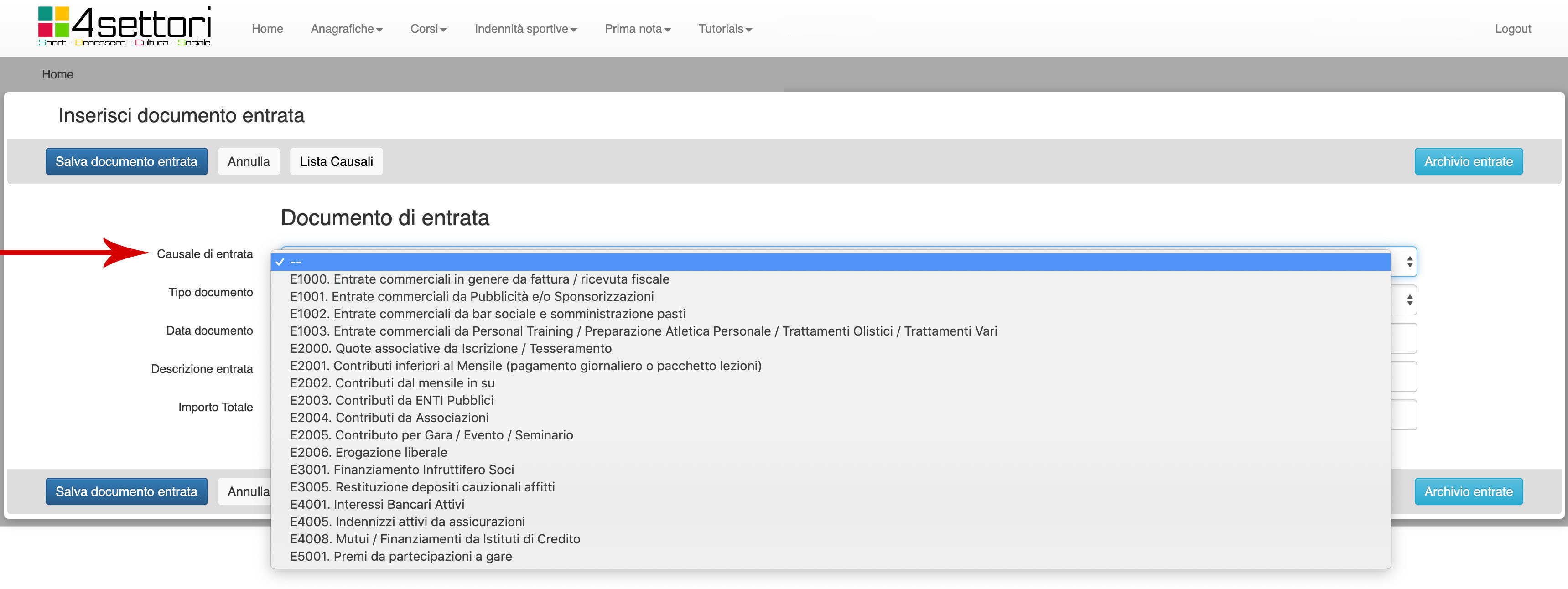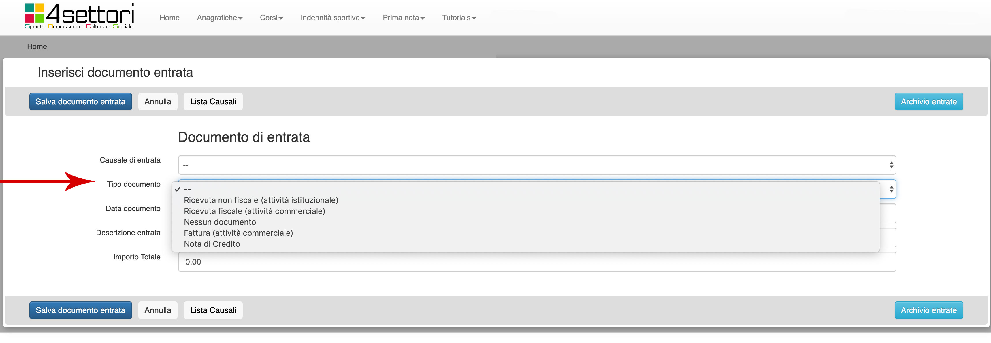 Inserire in Tipo documento (obbligatorio) la tipologia di ricevuta che il sodalzio ha rilasciato per la tipologia di entrata (non tutte le tipologie di entrate hanno le stesse scelte di documento di ricevuta).