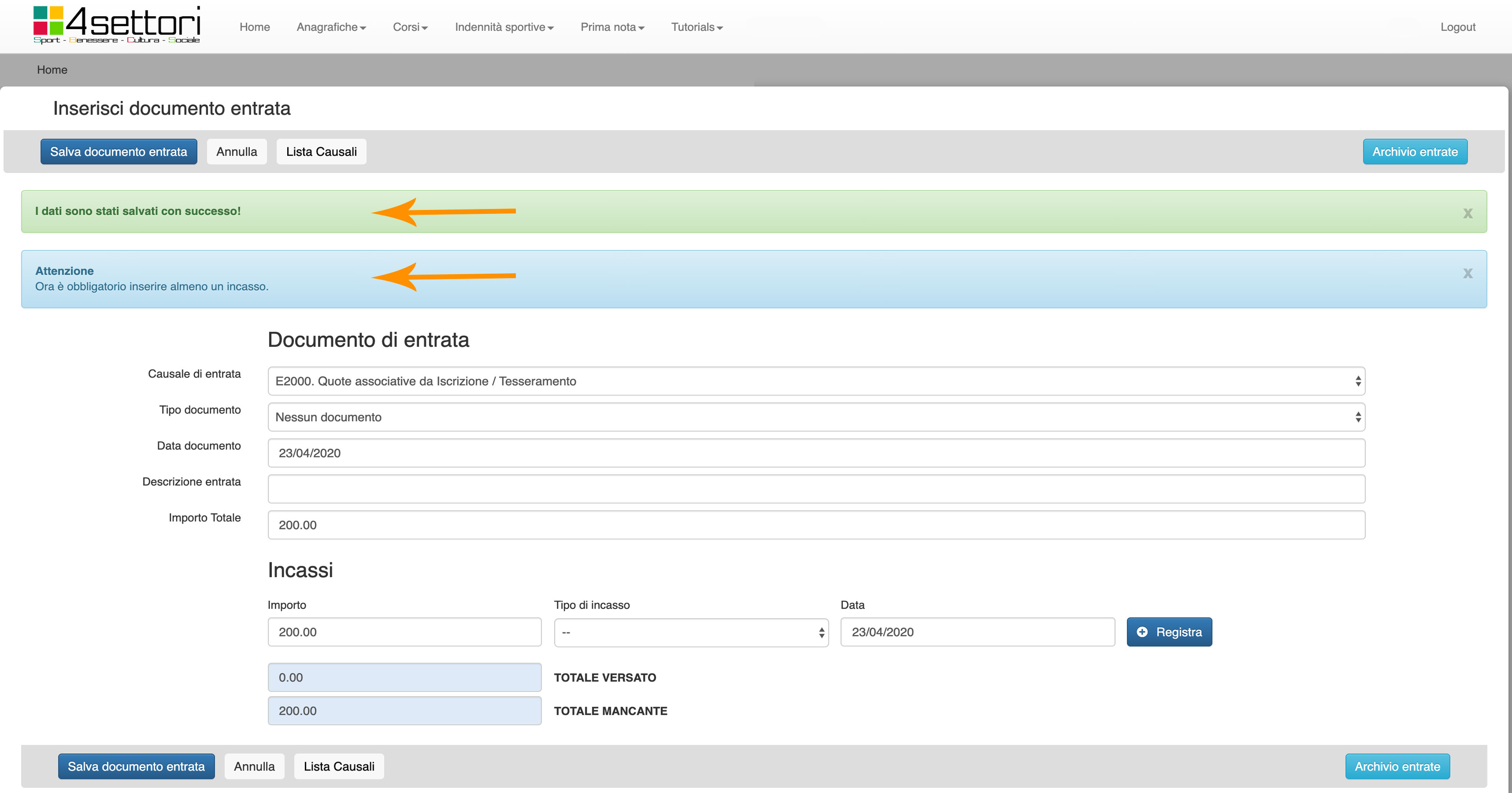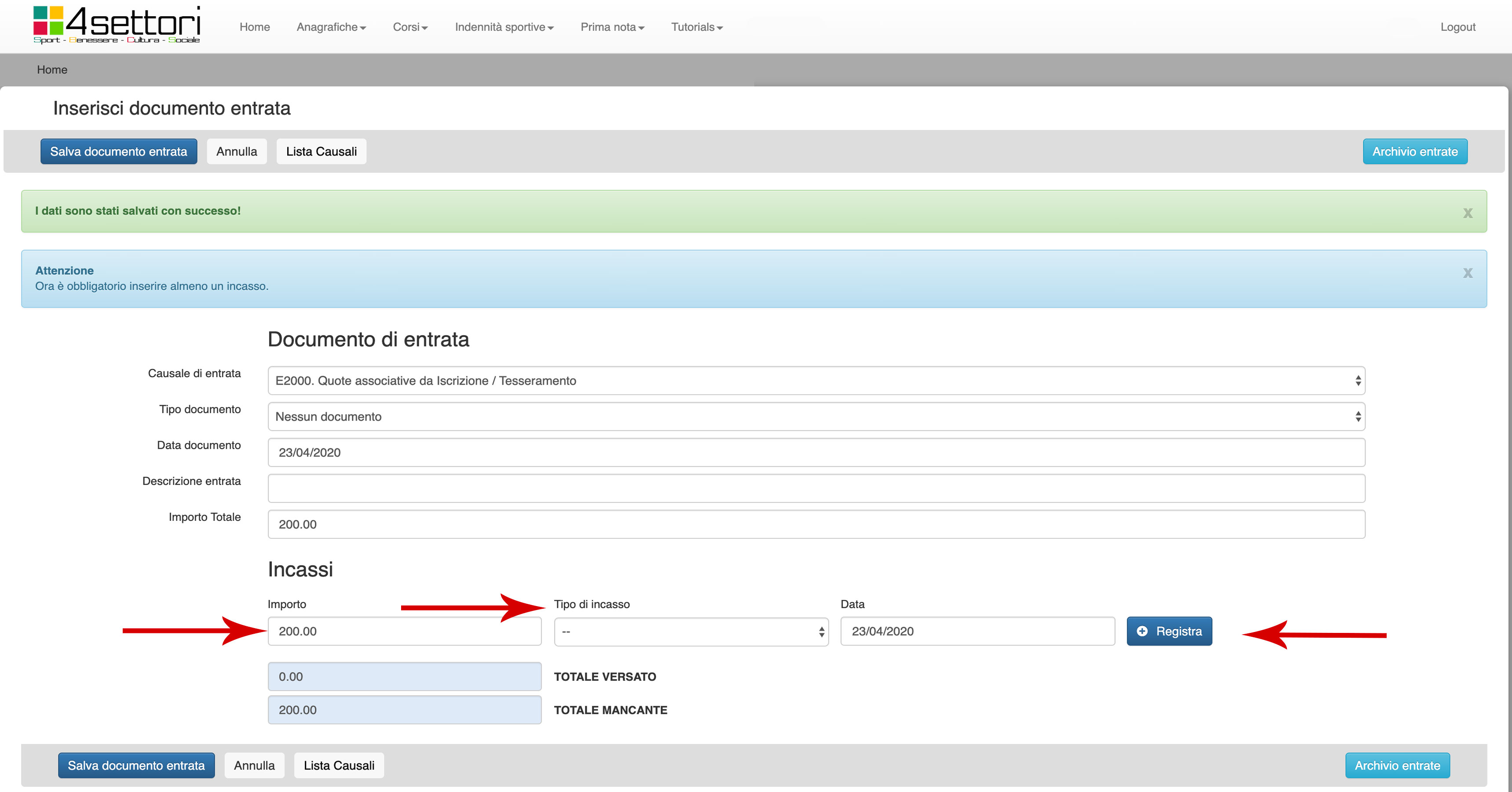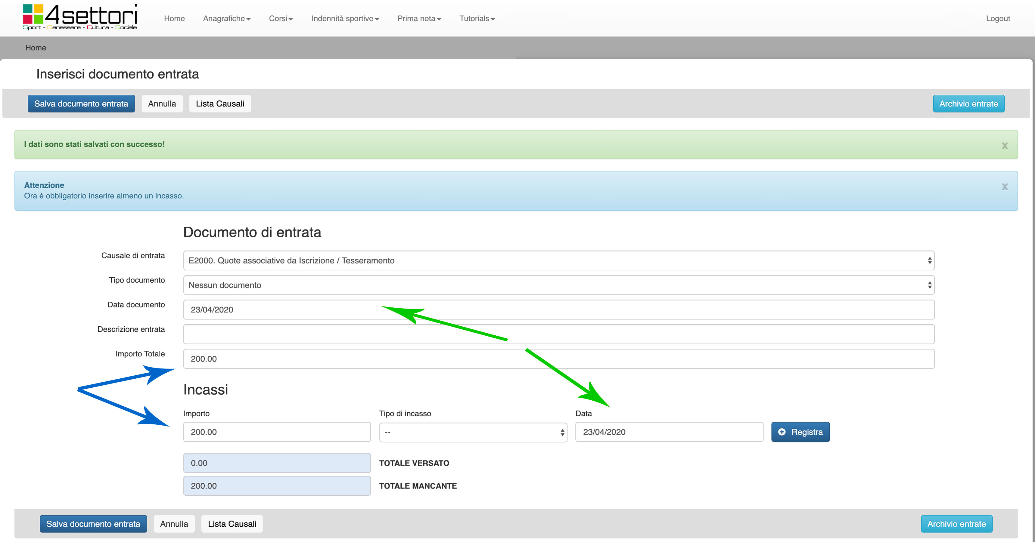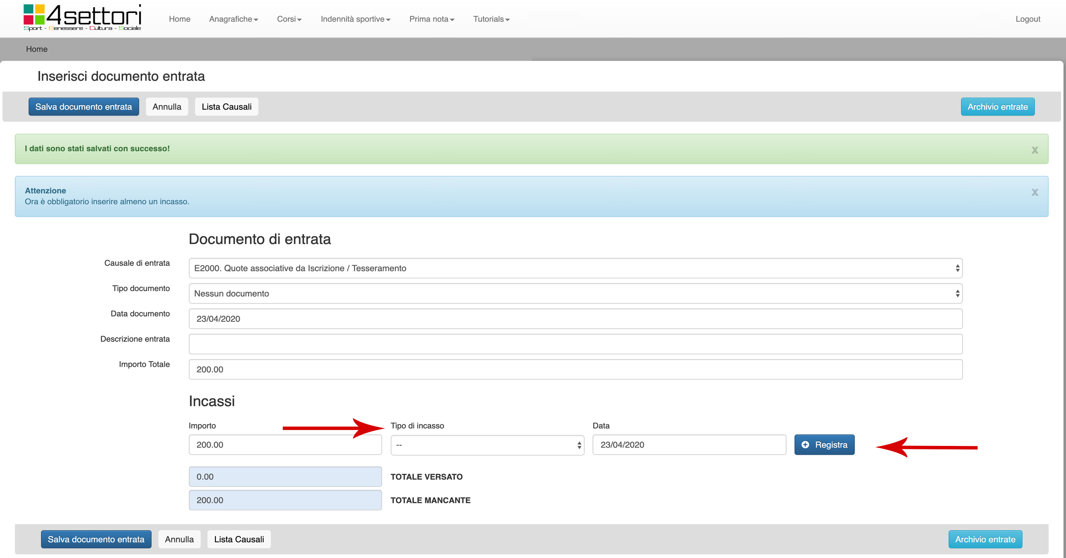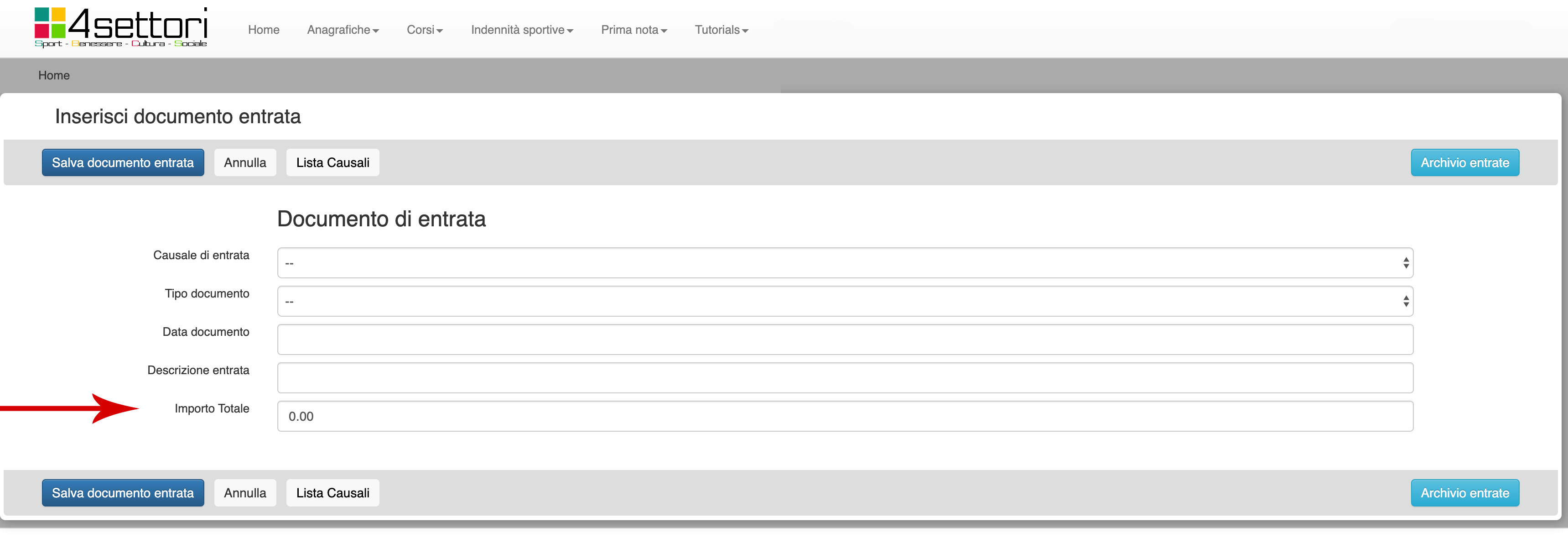 Inserire in Tipo documento (obbligatorio) la tipologia di ricevuta che il sodalzio ha rilasciato per la tipologia di entrata (non tutte le tipologie di entrate hanno le stesse scelte di documento di ricevuta).