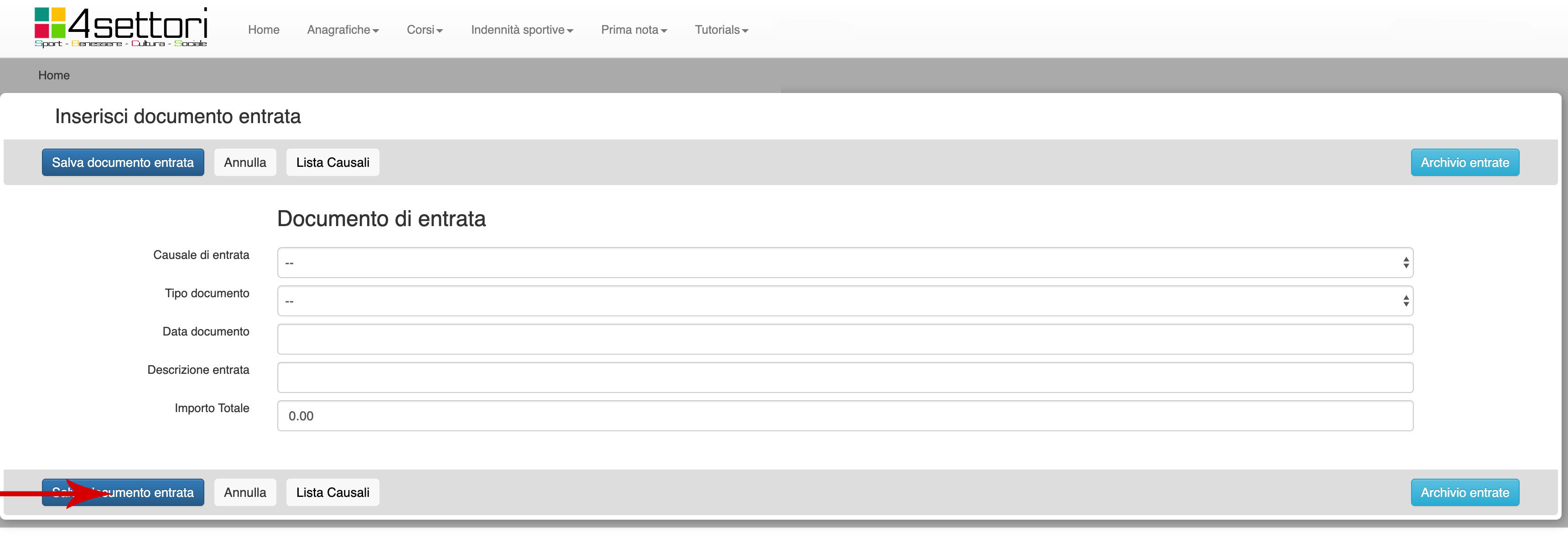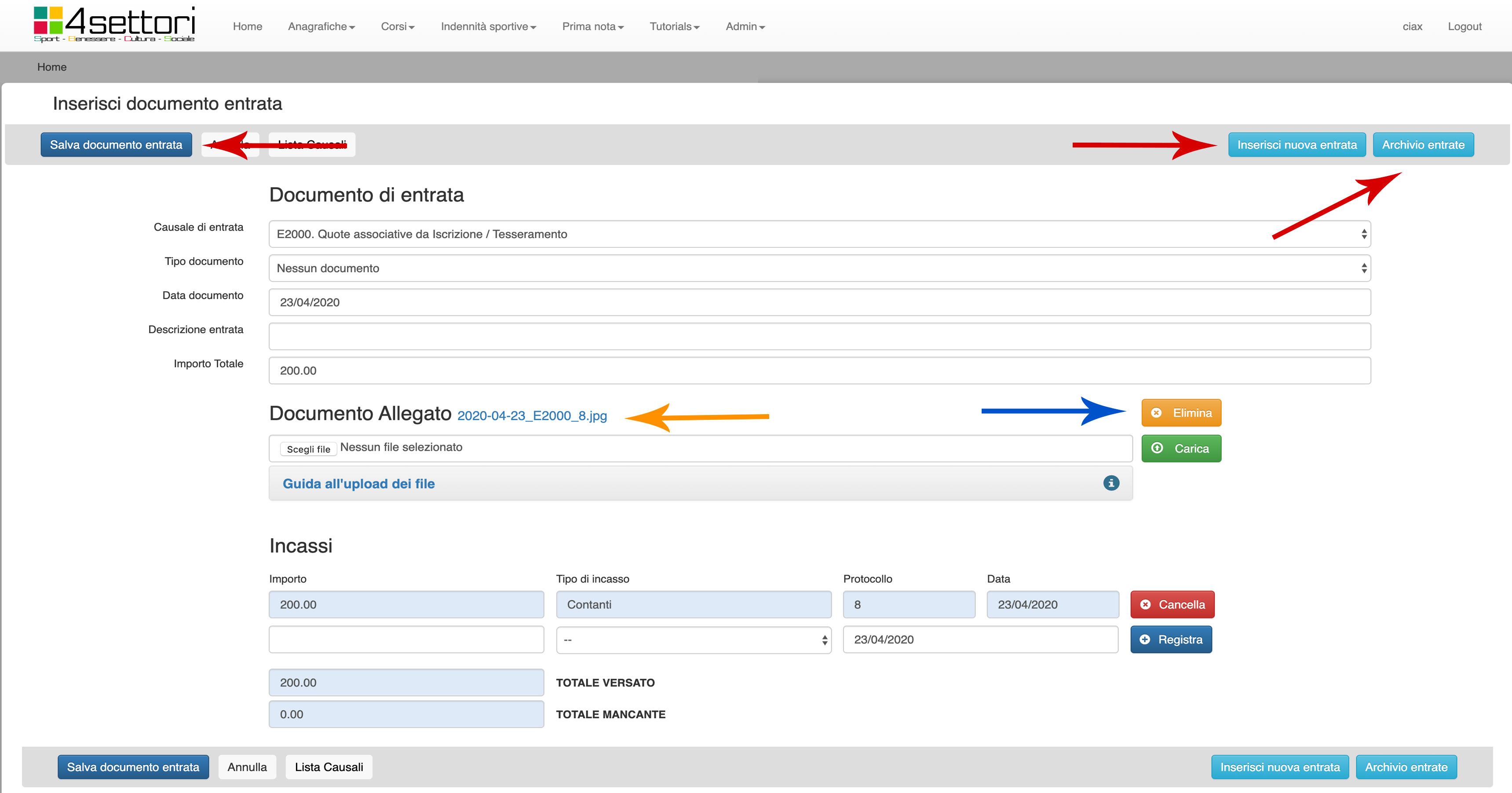 Per uscire dalla schermata si può premere un qualsiasi pulsante indicato dalle frecce rosse: "Salva documento entrata" oppure "Inserisci nuova entrata" oppure "Archivio entrate".