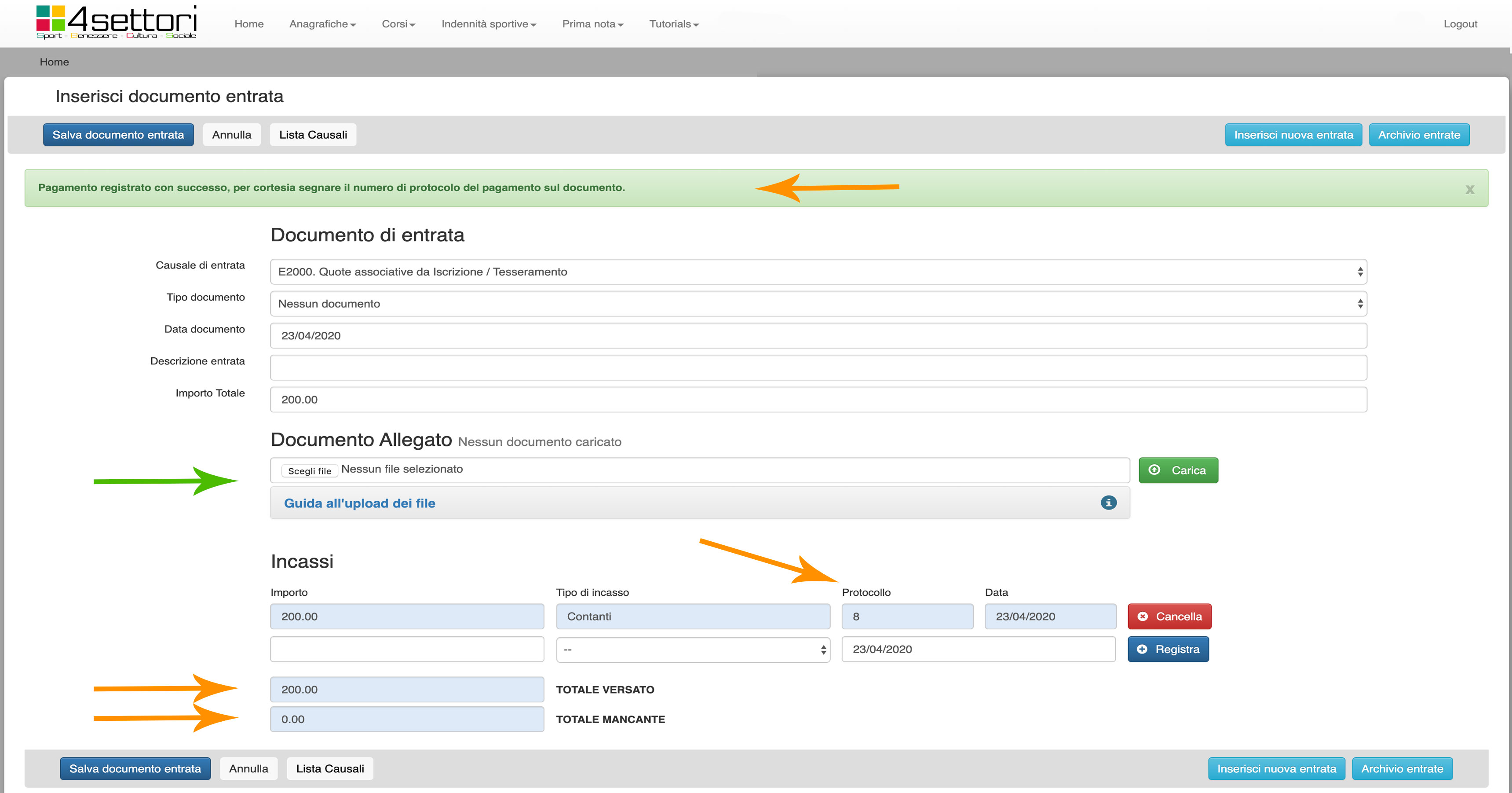 La schermata successiva alla registrazione ci comunica con un allert verde che "Pagamento registrato con successo, per cortesia segnare il numero di protocolo del pagamento sul documento." (freccia arancione alta); ci indica il totale versato e il totale mancante (frecce arancioni basse) che, in questo caso è zero assendo la somma saldata; ed il numero di protocollo dell'operazione.
