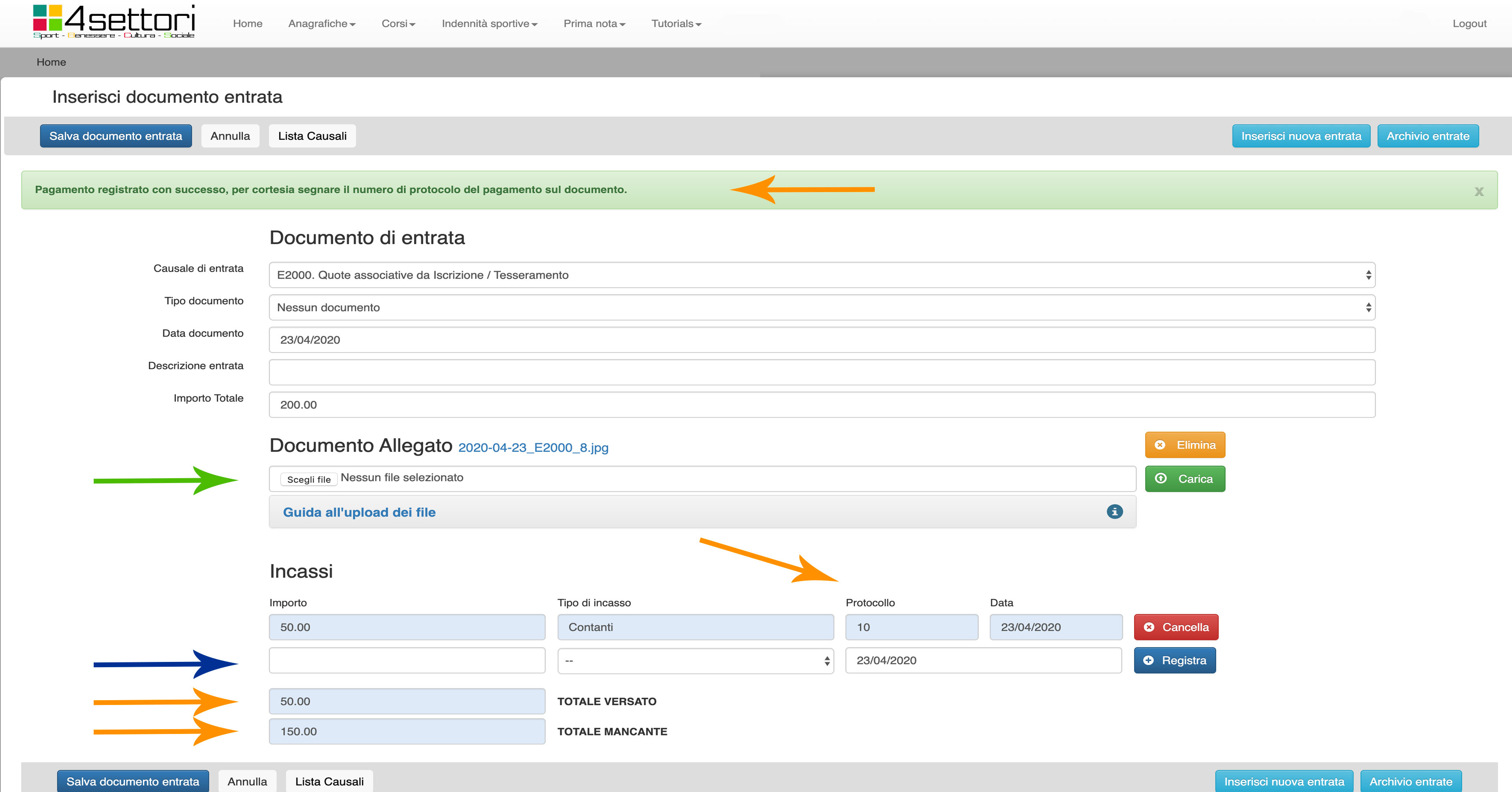 La schermata successiva alla registrazione ci comunica con un allert verde che "Pagamento registrato con successo, per cortesia segnare il numero di protocolo del pagamento sul documento." (freccia arancione alta); ci indica il totale versato e il totale mancante (frecce arancioni basse) che, nel caso di questo esempio è 150,00 Euro essendo stato versato un acconto di 50,00 Euro; ed il numero di protocollo dell'operazione.