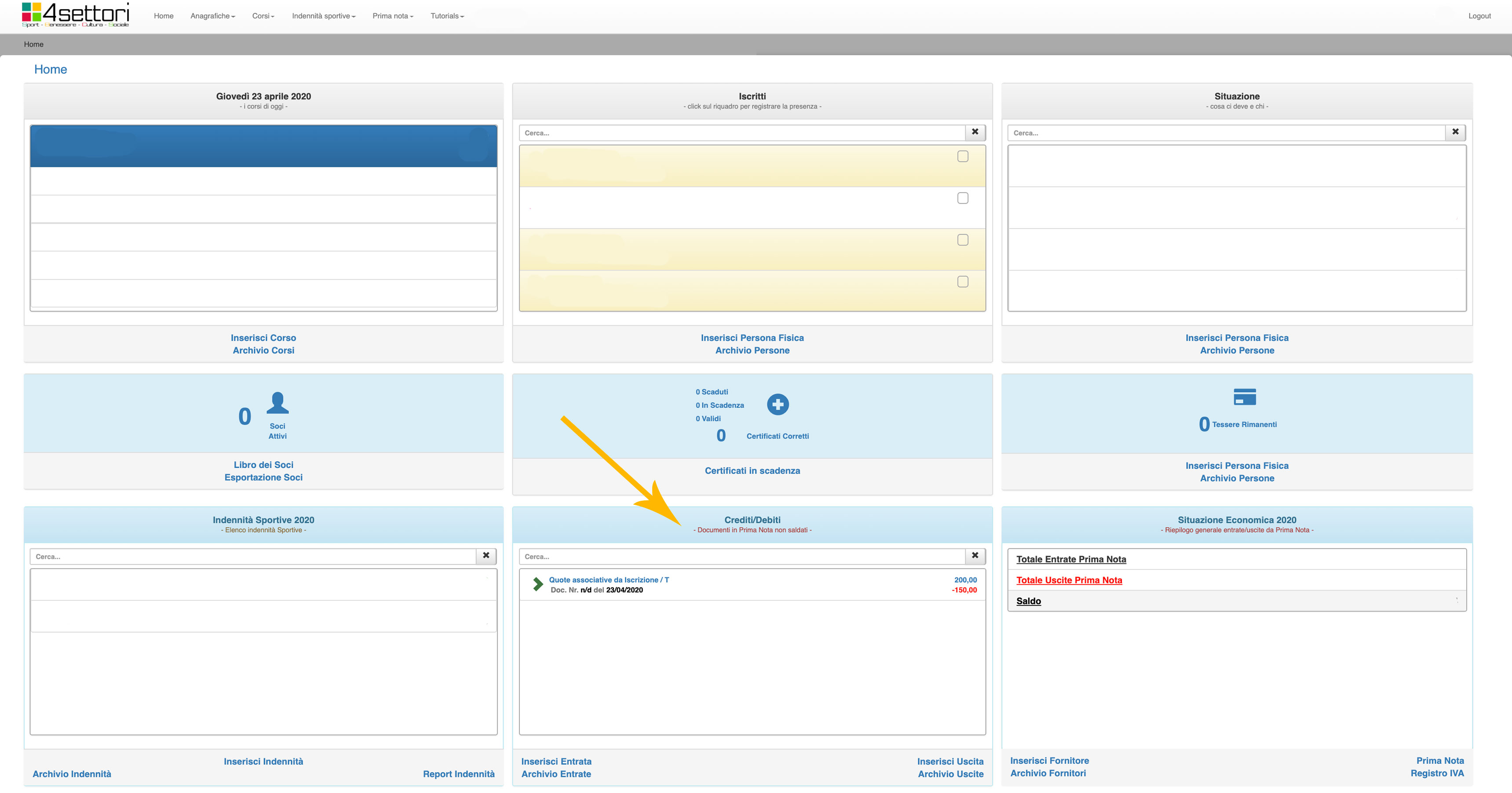 Da notare come, nel caso di acconti, nella HOME vanga indicato nel riquadro Crediti / Debiti (freccia arancione) che un'entrata (segno verde) non è stata saldata indicandone l'importo totale in blu e la data nonchè il mancante in rosso.