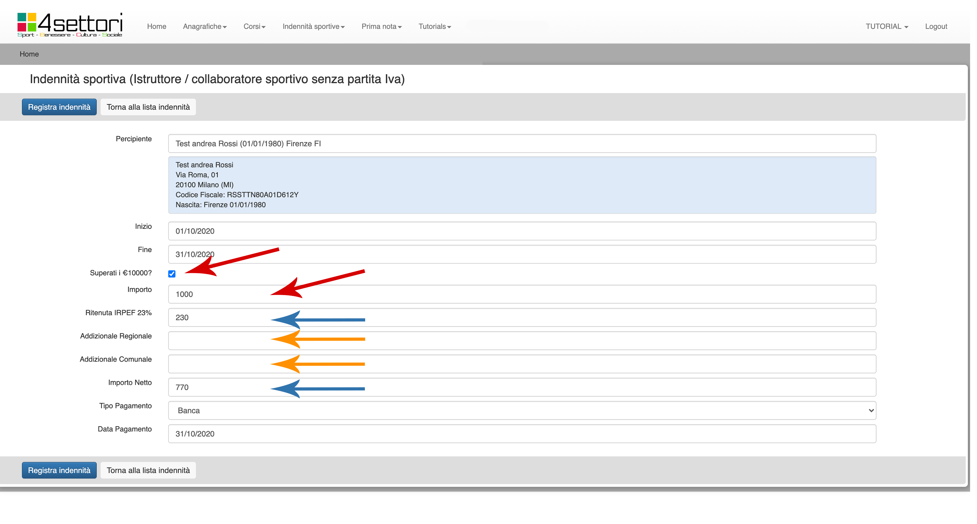 Inserendo l'importo che da adesso diventerà lordo (nel nostro esempio euro 1.000,00) la ritenuta IRPEF verrà calcolata automaticamente dal gestionale mentre l'addizionale regionale e quella comunale deve essere calcolata dall'utente in base alla regione e al comune di residenza del percipiente come ben specificato il questo articolo: http://www.4settori.net/guide/regime-fiscale/indennita-attivita-sportiva-dilettantistica.html .