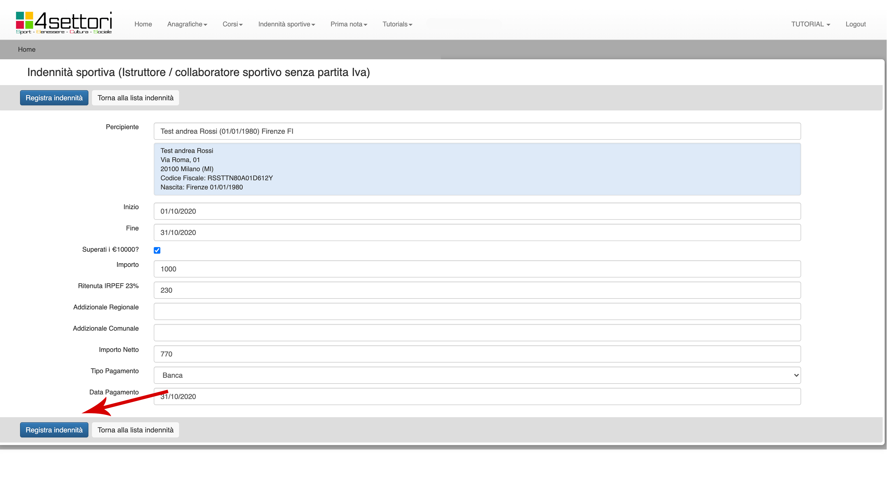 Salviamo i dati inseriti premendo sul pulsante blu Registra indennità.