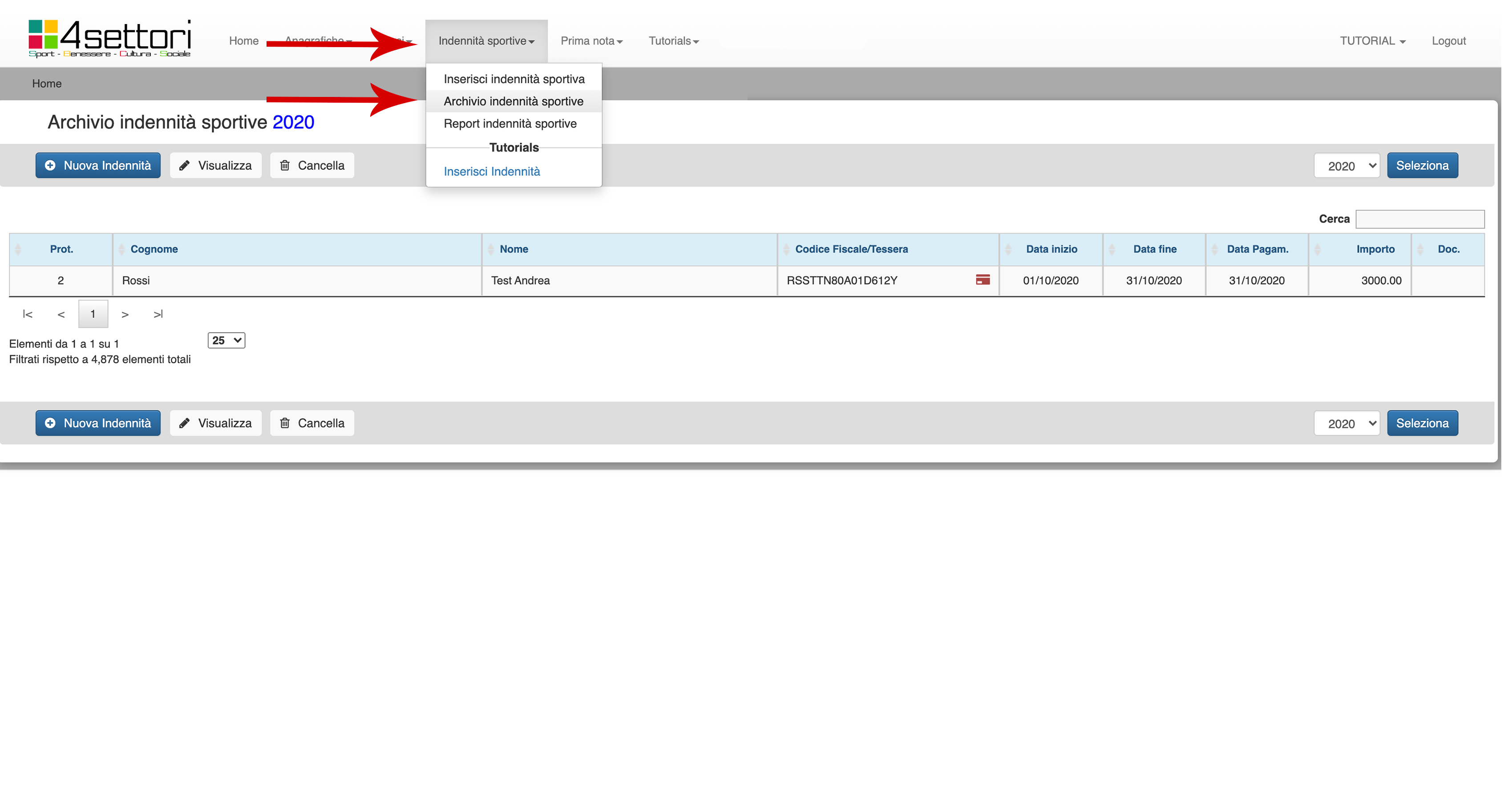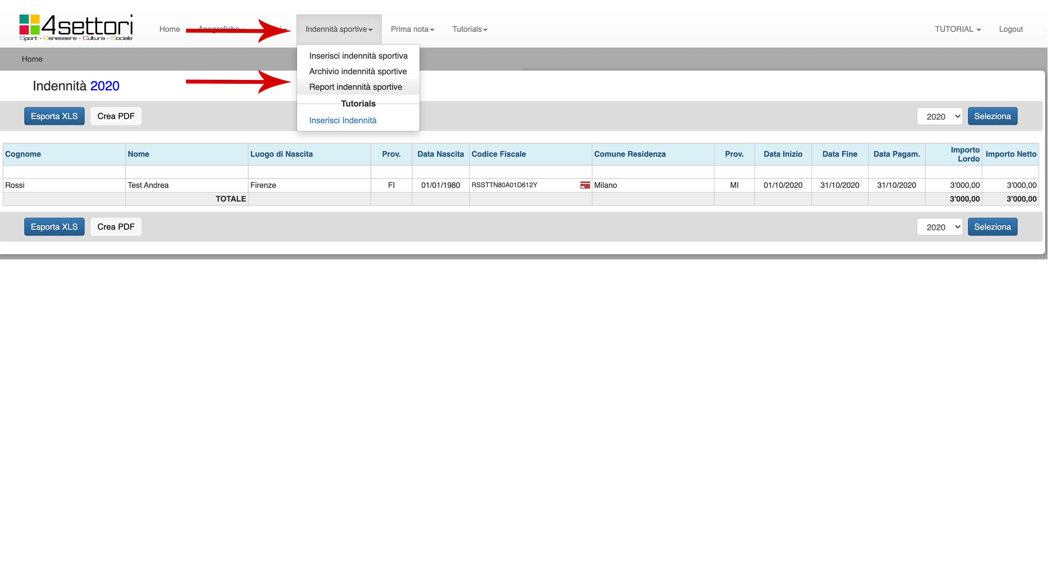 Andando al menu Indennità sportive e, successivamente, a Report indennità sportive potremo controllare l'inserimento corretto dell'indennità.