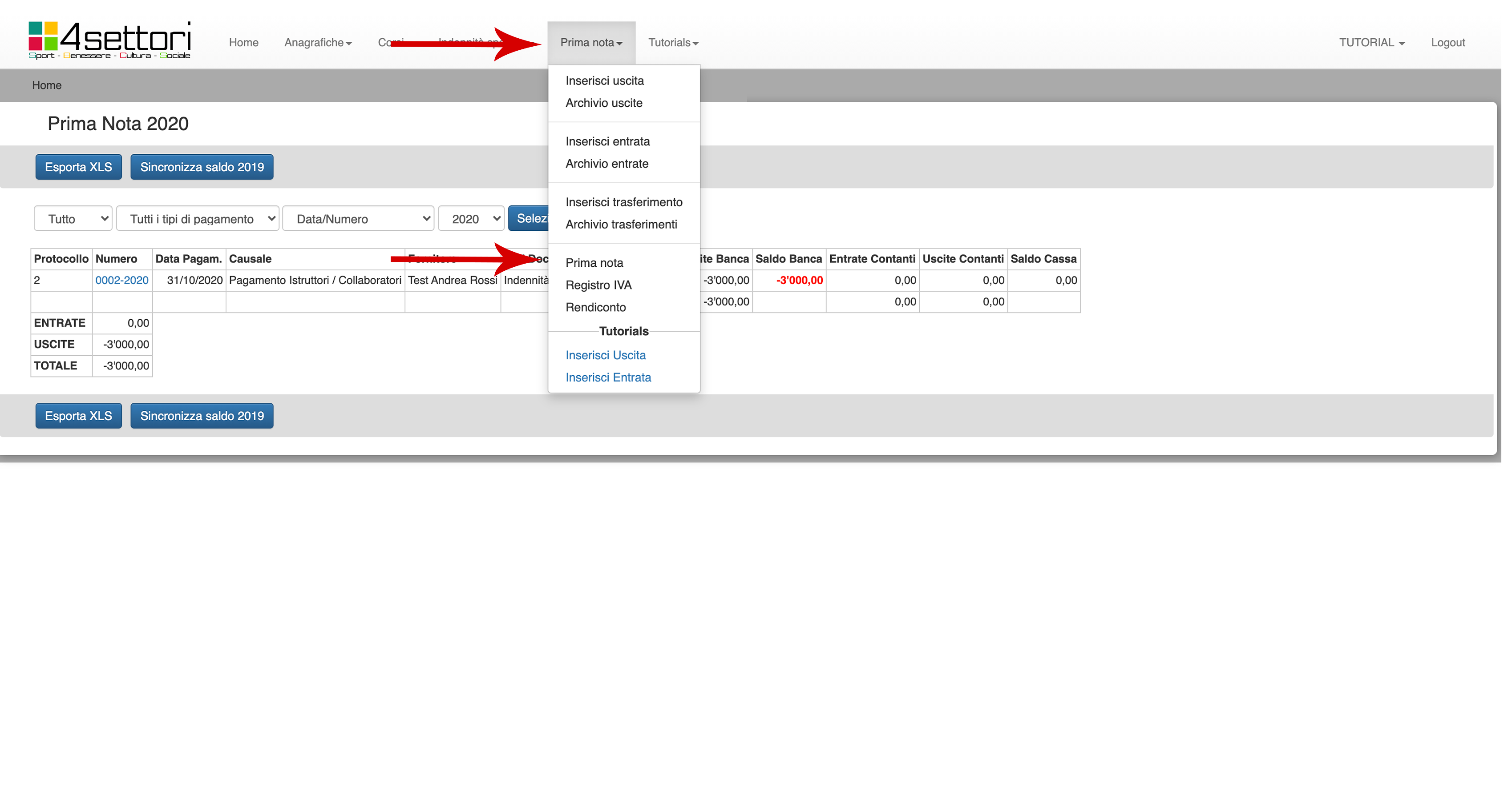 Per uscire dalla schermata si può premere un qualsiasi pulsante indicato dalle frecce rosse: Salva documento entrata oppure Inserisci nuova entrata oppure Archivio entrate.
