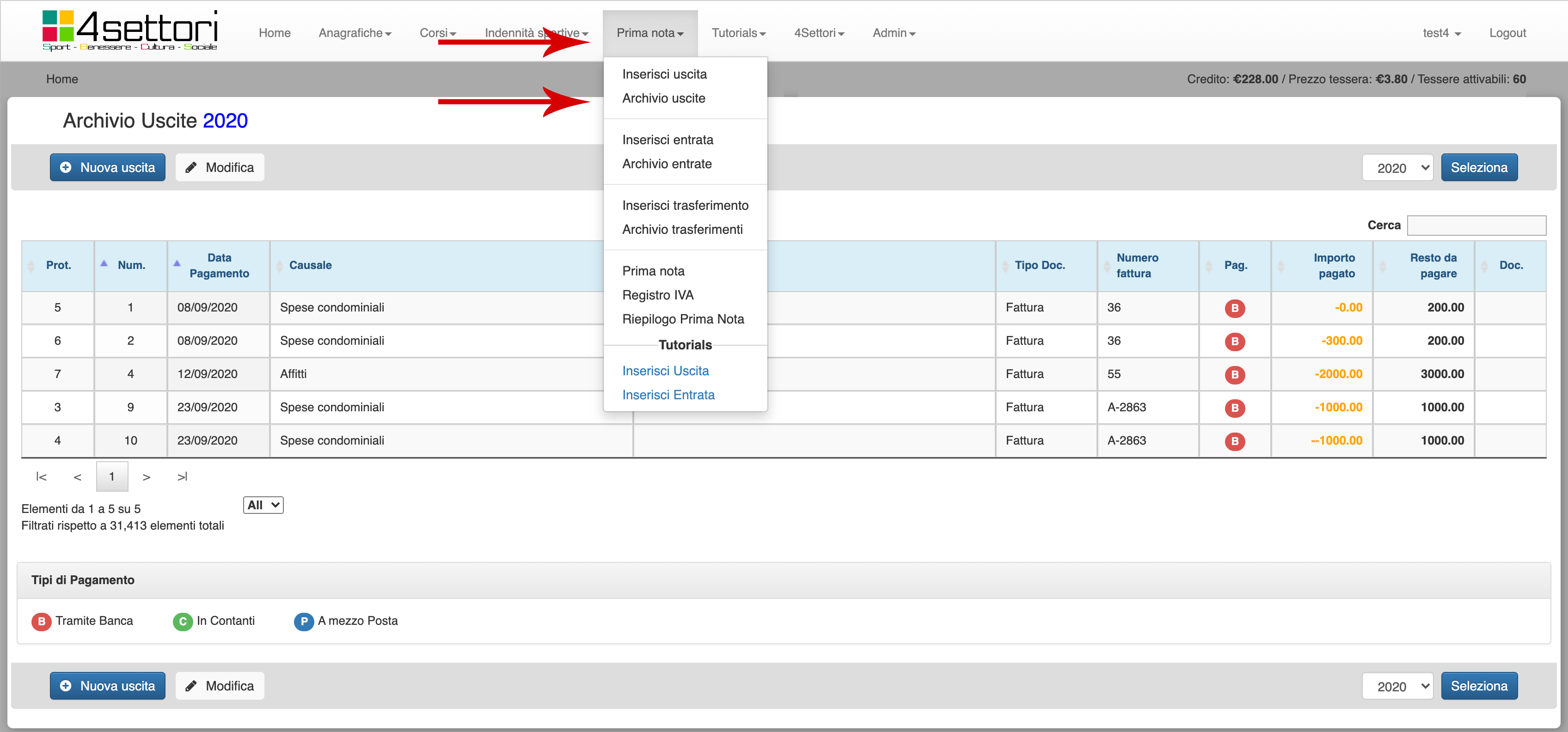 Una volta effettuato l'accesso a 4Gest andare al menu Prima nota e, successivamente, a Archivio uscite.