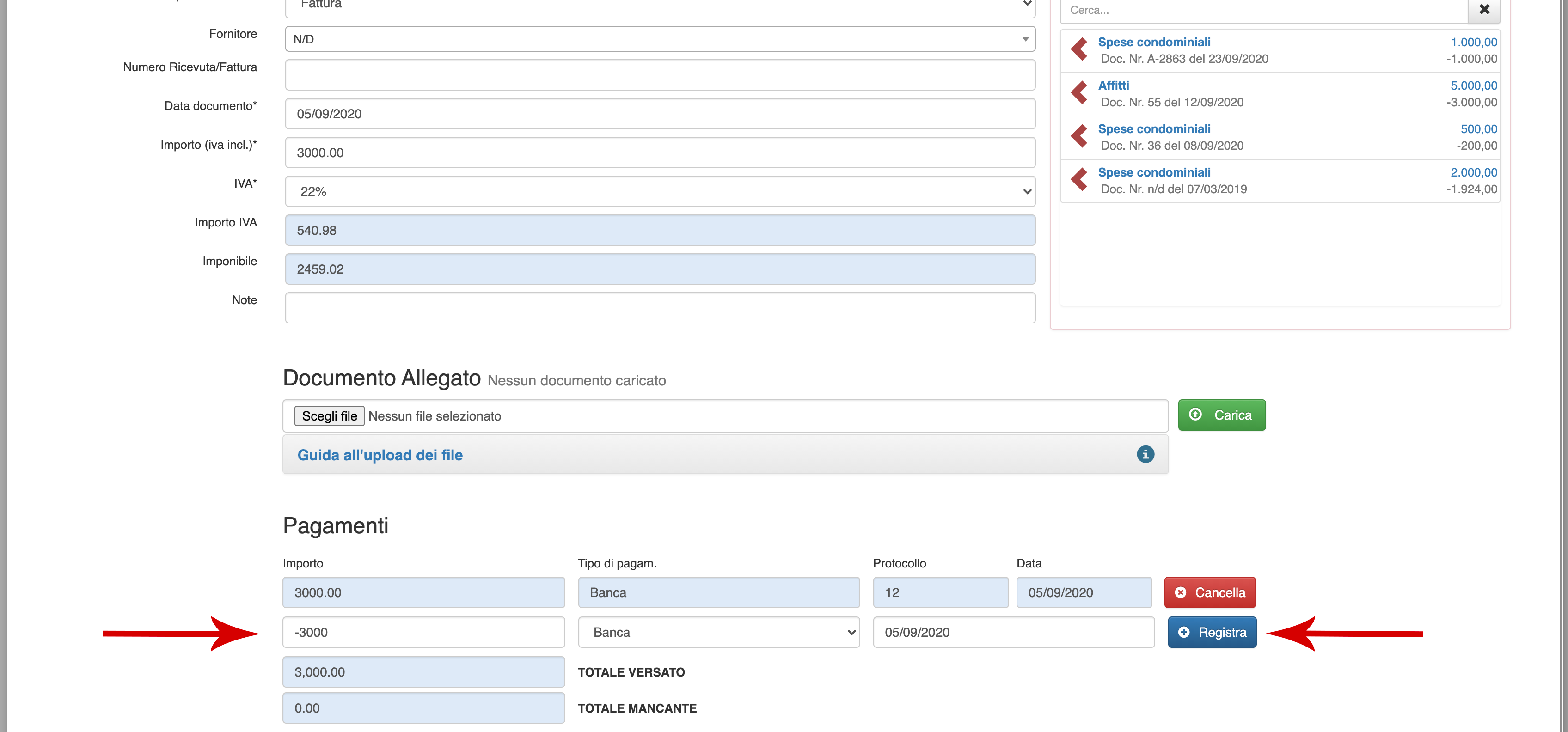Inserire la somma tornata indietro con il segno negativo e cliccare sul pulsante blu Registra.